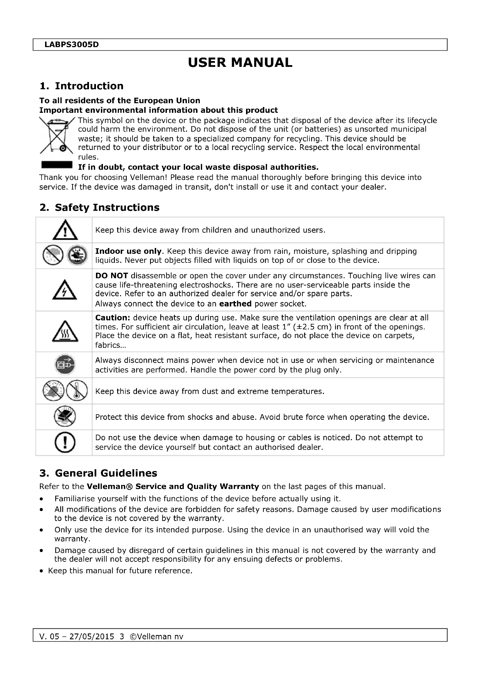 Refer to the Velleman® Service and Quality Warranty on the last pages of this manual. Familiarise yourself with the functions of the device before actually using it. All modifications of the device are forbidden for safety reasons. Damage caused by user modifications to the device is not covered by the warranty. Only use the device for its intended purpose. Using the device in an unauthorised way will void the warranty. Damage caused by disregard of certain guidelines in this manual is not covered by the warranty and the dealer will not accept responsibility for any ensuing defects or problems. Keep this manual for future reference.LABPS3005D