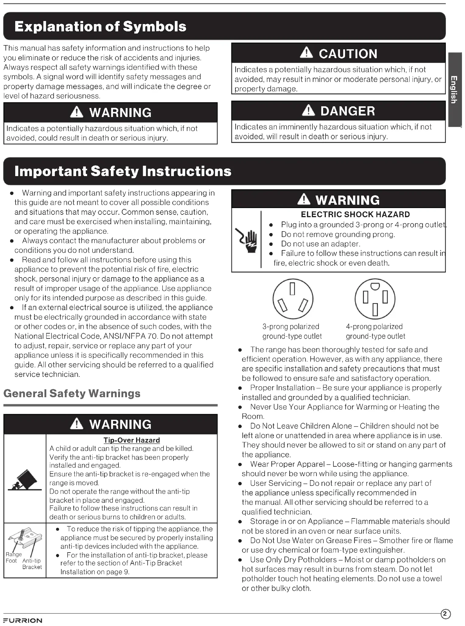 ● Plug into a grounded 3-prong or 4-prong outlet. ● Do not remove grounding prong. ● Do not use an adapter. ● Disconnect power before servicing. ● Replace all parts and panels before operating. ● Failure to follow these instructions can result in fire, electric shock or even death. Observe all governing codes and ordinances. The installation must conform with local codes or in the absence of such codes, refer to the latest edition of: ● In the U.S.A., the installation must conform with: ANSI/NFPA70. ● In Canada, the installation must conform with: C22.1-18, Canadian Electrical Code, Part I. ● If Manufactured home installations, please follow ANSI A 225.1/NFPA 501A or local codes. What’s in the Box WARNING SUFFOCATION HAZARD ● Dispose packaging material or keep from reach of small children. ● Failure to follow instruction could lead to serious injury or death. WARNING Always wear protective gear such as gloves, eyewear and clothing to avoid injuries during installation of the product. Remove product from packaging and make sure you have the following list of items included. If any item is damaged or missing, contact your Furrion dealer. Part Description Quantity24” Electric Range 1 Backsplash Assembly (Backsplash and six screws M4x12mm) Oven Racks 2Rotisserie 1 Anti-tip Bracket (Set) ● Screw (M5x30mm) x 2 ● Washer x 2 ● Anti-bracket x 1 User Manual 1Warranty Manual 18 English Tools You Will Need (Not Provided) Part Description Electric Drill (Drill bit diameter for the anchor is ⁄” 8mm). Safety Goggles Gloves Adjustable Wrench Tape Measure Pencil Phillips Screwdriver (M4, +Type Head) Flat Blade Screwdriver Cutting Knife Level (UL Listed 50 AMP) 4-Wire Cord 6’ long OR 3-Wire Cord 6’ long Mounting Anchors for masonry/cement floors. Cabinet Constructing Instructions ● For proper operation of your range, the cabinets must be properly constructed and squared with respect to the counter top and the cabinet face. ● For proper operation of these units, the cabinet must be level and the bottom of the range must be supported. Use an insulated pad or ¼” (64mm) plywood under the range if installing the range over carpeting. NOTE: When planning the location, consider curtains or other combustible materials installed around the appliance so as not to create a fire hazard. ● All openings in the counter or floor where the range is to be installed must be sealed. ● The floor anti-tip bracket must be installed properly. To install the anti-tip bracket shipped with the range, refer to “Anti- Tip Bracket Installation” section for the detail installation instructions of the anti-tip bracket shipped with the range. ● Grounded electrical supply is required. Refer to “Electric Connection” section. ● Maximum allowable wood cabinet temperatures of 194°F (90°C). Cabinet Installation ● The minimum horizontal distance(s) from sides and top of appliance to adjacent vertical combustible walls extending above the top panel. (Fig. 1) Side WallFig. 1Rear Wall Item Dimension