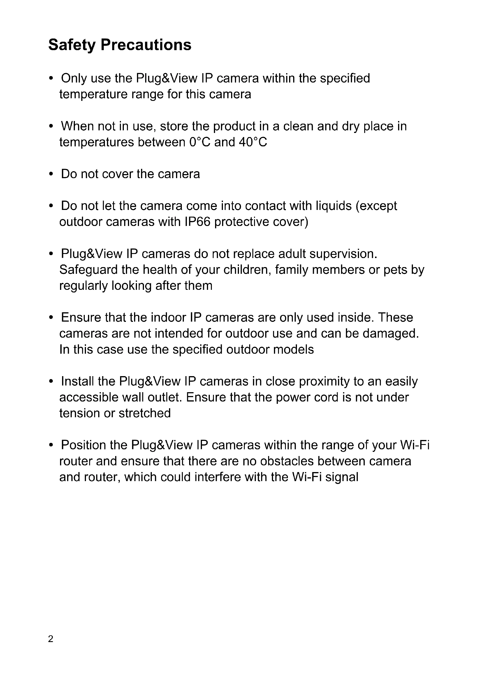 Quick Installation Guide. (QIG)2 Safety Precautions Only use the Plug&View IP camera within the specified temperature range for this camera When not in use, store the product in a clean and dry place in temperatures between 0°C and 40°C Do not cover the camera Do not let the camera come into contact with liquids (except outdoor cameras with IP66 protective cover) Plug&View IP cameras do not replace adult supervision. Safeguard the health of your children, family members or pets by regularly looking after them Ensure that the indoor IP cameras are only used inside. These cameras are not intended for outdoor use and can be damaged. In this case use the specified outdoor models Install the Plug&View IP cameras in close proximity to an easily accessible wall outlet. Ensure that the power cord is not under tension or stretched Position the Plug&View IP cameras within the range of your Wi-Fi router and ensure that there are no obstacles between camera and router, which could interfere with the Wi-Fi signal3 Protect the Plug&View IP cameras from electrical and other HF devices generating interferences (microwaves, mobile phones, etc.) Keep camera, network cable and power cord outside the reach of children, since these components can be dangerous Only use the supplied power adapter. Never try to repair Plug&View IP cameras yourself. Repair and maintenance work must be carried out by specialists. In case of problems contact our customer service. Observe all applicable laws regarding camera monitoring. The Plug&View IP cameras are intended for private use at home. Inform your family members, relatives and domestic helpers in your household with regard to video monitoring. Ensure that public areas and your neighbors’ properties cannot be seen.4 Personal Information Read and accept the privacy policy for using the DIGITUS