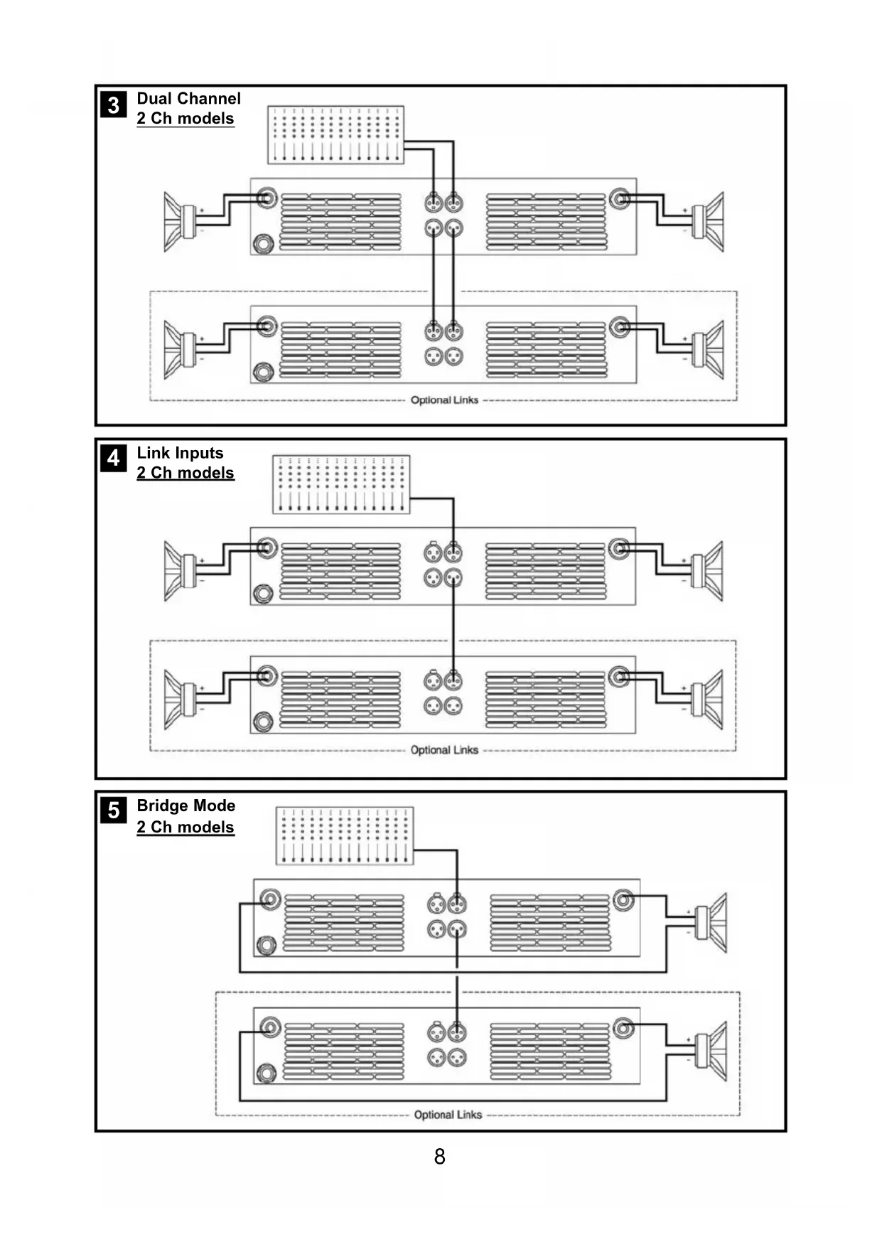 6Installation and Operation Installation et mise en service The amplifier can operate on three dif- ferent configurations: DUAL, LINK or BRIDGE. The connections for the three modes are different. See Figure - Set the Amplifier Mode to “DUAL”. - Select the chosen Gain (Default set- ting 32dB). - Connect the signal lines to the female XLR connectors on all channels. - Connect the speakers’ lines to the cor- responding Speakon on the amp respecting the polarity. - Use the level control knob on the front panel to adjust each channel indepen- dently. - Each signalling LED group will show its corresponding channel status. See Figure - Operate as Dual Channel Mode with the signal input linked to another adja- cent channel. See Figure - Set the configuration mode to “BRIDGE” (see page 9). - Select the chosen Gain (Default set- ting 32dB). - Connect a signal line to input female XLR Channel “A” (or Ch-C in 4 chan- nel models). - Connect the speaker line to the Channel A Speakon (or Ch-C in 4 channel models) wired to +1 and -2. In this way pin +1 is positive. - Use Channel-A (or Ch-C in 4 channel modes) control knob to adjust the amp’s output. - The signalling LED groups will show the single channel status. WARNING! The “