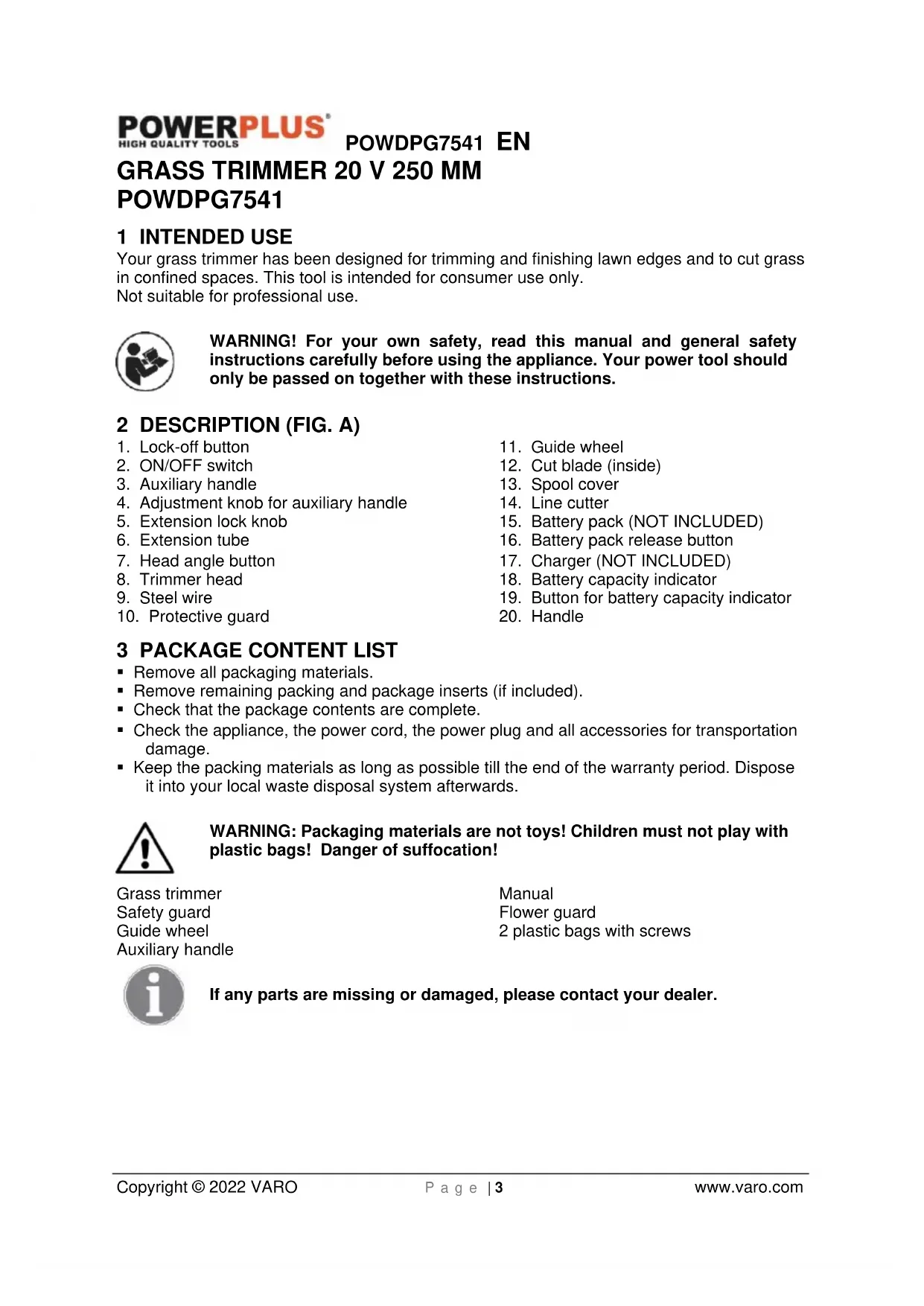 VARO – Vic. Van Rompuy N.V. - Joseph Van Instraat 9 - BE2500 Lier - BELGIUM, declares that, Product: Lawn Trimmer Trade mark: PowerPlus Model: POWDPG7541 is in conformity with the essential requirements and other relevant provisions of the applicable European Directives, based on the application of European harmonized standards. Any unauthorized modification of the apparatus voids this declaration. European Directives (including, if applicable, their amendments up to the date of signature); 2011/65/EU 2006/42/EC 2014/30/EU 2000/14/EC Annex VI LwA Measured 86 dB(A) Guaranteed 88 dB(A) Notified Body TÜV SÜD European harmonized standards (including, if applicable, their amendments up to the date of signature); EN60335-1 : 2012 EN50636-2-91 : 2014 EN55014-1 : 2017 EN55014-2 : 2015 Keeper of the Technical Documentation: Philippe Vankerkhove, VARO – Vic. Van Rompuy N.V. The undersigned acts on behalf of the company CEO, Ludo Mertens Regulatory Affairs – Compliance Manager 30/12/2021, Lier - BelgiumPOWDPG7541 DE Copyright © 2022 VARO Seite | 1 www.varo.com 1 BESTIMMUNGSGEMÄßE VERWENDUNG .................................... 3