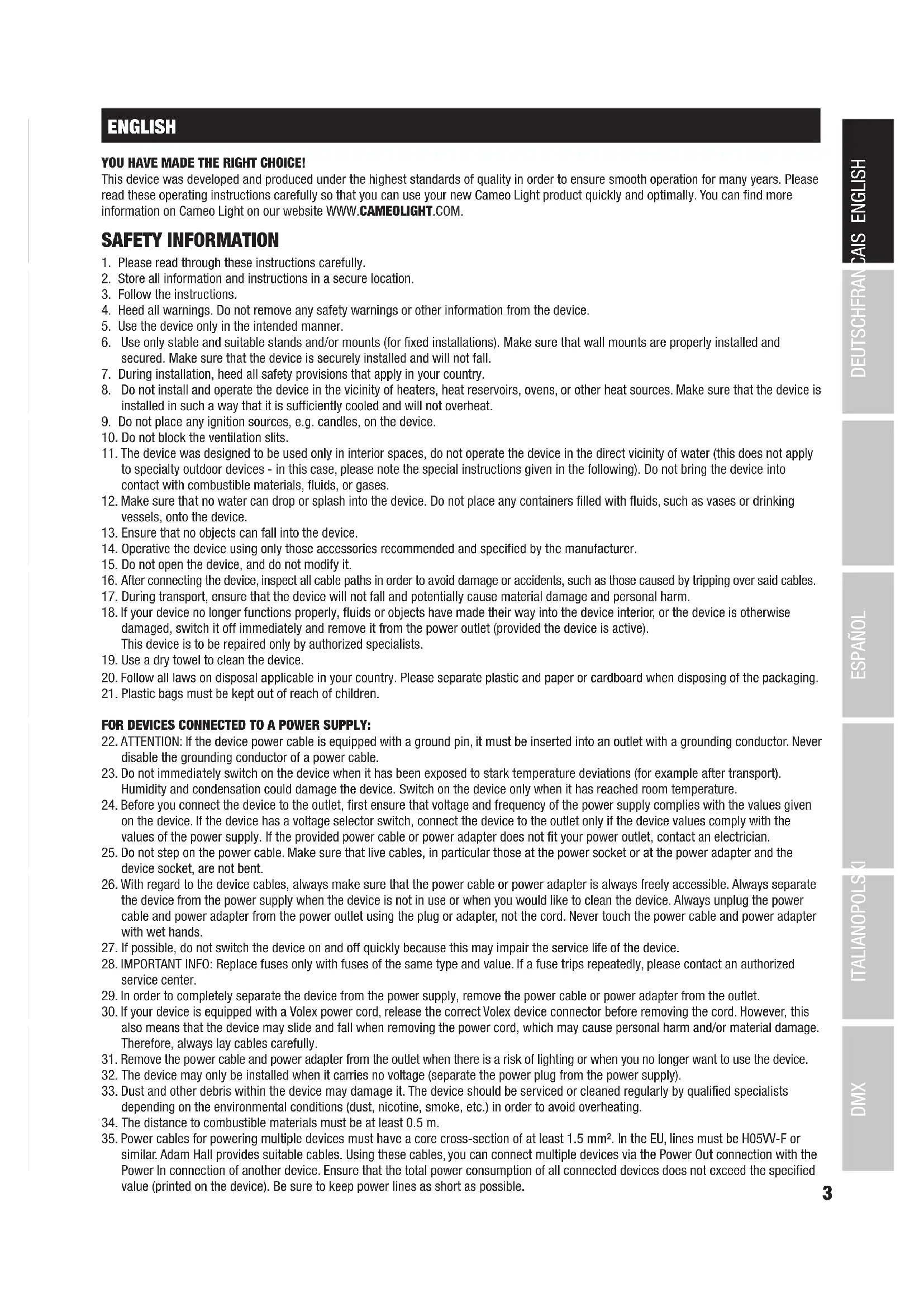 DMX DEUTSCHFRANCAIS ESPAÑOL ENGLISH ITALIANO POLSKI ENGLISH YOU HAVE MADE THE RIGHT CHOICE! This device was developed and produced under the highest standards of quality in order to ensure smooth operation for many years. Please read these operating instructions carefully so that you can use your new Cameo Light product quickly and optimally. You can find more information on Cameo Light on our website WWW.CAMEOLIGHT.COM. SAFETY INFORMATION