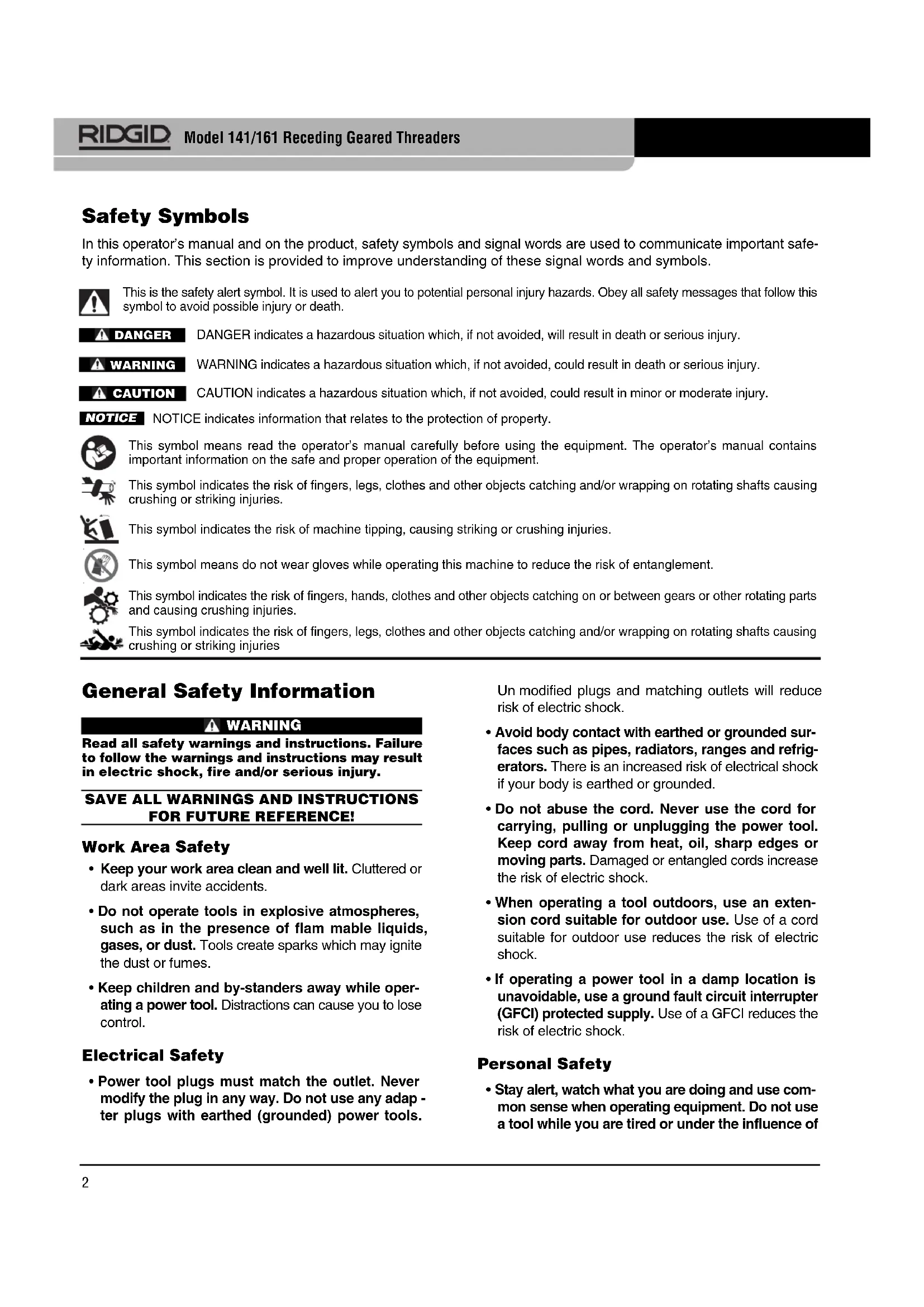 - When servicing a tool, use only identical replace- ment parts. Follow instructions in the Maintenance section of this manual. Use of unauthorized parts or failure to follow Maintenance Instructions may create a risk of electrical shock or injury. Specific Safety Information WARNING This section contains important safety information that is specific to this tool. Read these precautions carefully before using Model 141/161 Receding Geared Threaders to reduce the risk of electrical shock or other serious injury. SAVE THESE INSTRUCTIONS! Keep this manual with machine for use by the operator. Receding Geared Threaders Safety