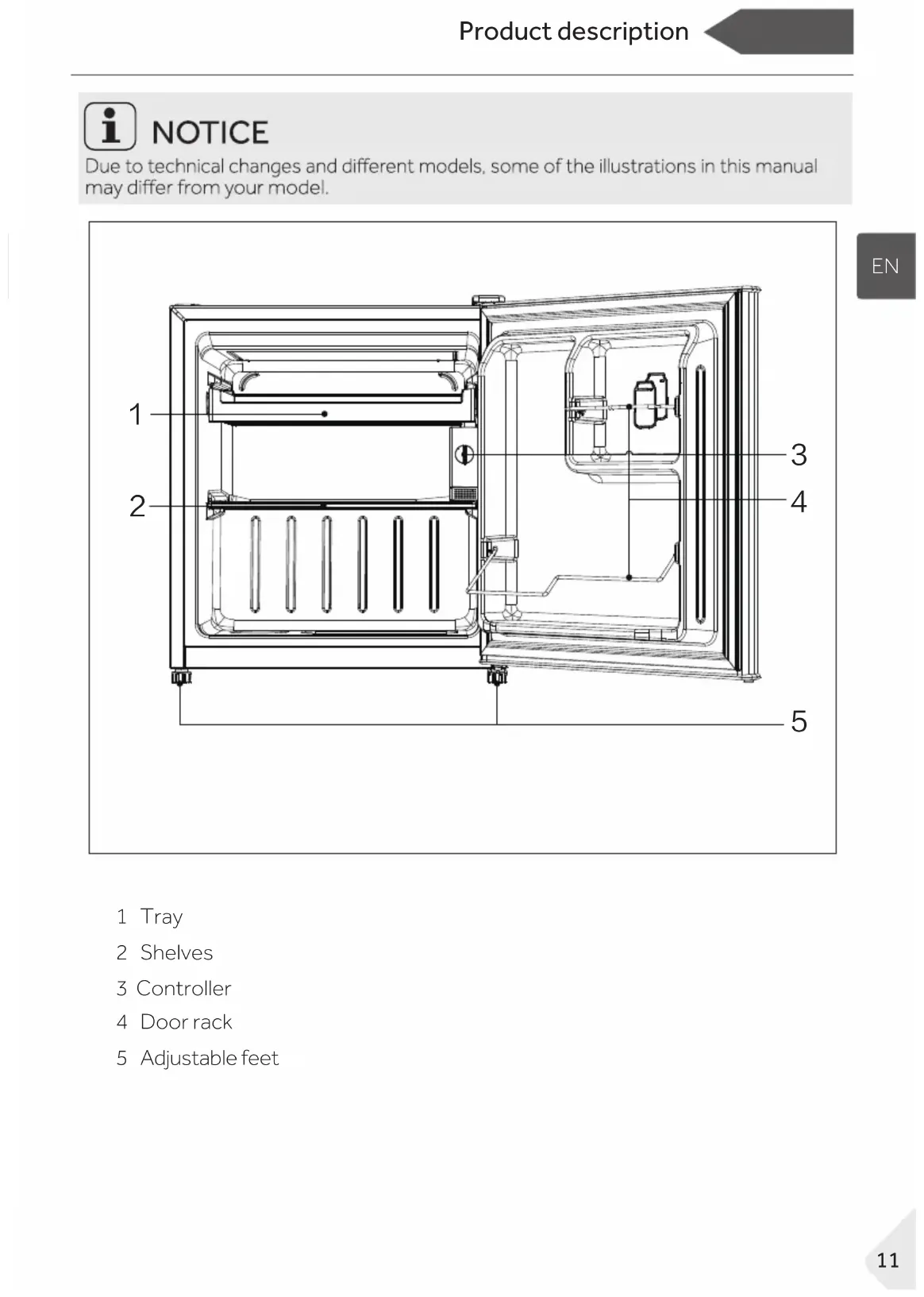 ▶ Remove all packaging materials, keep them out of children`s reach and dispose them in an environmentally friendly manner. ▶ Clean the inside and outside of the appliance with water and a mild detergent before putting any food in it. ▶ After the appliance has been levelled and cleaned, wait for at least 2-5 hours before connecting it to the power supply. See Section INSTALLATION. ▶ Precool the compartments at high settings before loading with food. The "OFF" position on the knob is the shutdown position. When this position is set, the refrigerator will not cool.If the refrigerator needs to be stopped for a long time, please unplug the power plug. The temperature in the refrigerator is adjusted by the temperature controller and the smaller the power consumption of the refrigerator; The stronger the the power consumption of the refrigerator. The "MAX" position of the scale is the lowest temperature gear in the refrigerator. This position can be used for quick freezing. After the food is completely frozen, please turn the scale back to the original setting gear Gear Description The common gear of the refrigerator is the "MID" position of the scale turned on. If the temperature in the box is too high, please increase the scale appropriately. If the temperature in the box is too low, please reduce the gradient appropriately. Please select the position of the temperature controller knob scale according to the actual needs. When the ambient temperature of the refrigerator is high, if the scale number set is large, the ice may not stop, and the temperature in the cabinet may be too low. When the ambient temperature of the refrigerator is low, if the scale number is set to be small, the refrigerator may not be started, resulting in high temperature in the box, which is not conducive to food storage and preservation After the temperature is adjusted, it takes a period of time to achieve the temperature balance in the box. And the length of this period depends on the size of the changed gear, the ambient tem- perature, the frequency of opening the door, and the amount of food stored in the box Proposal ReminderEN