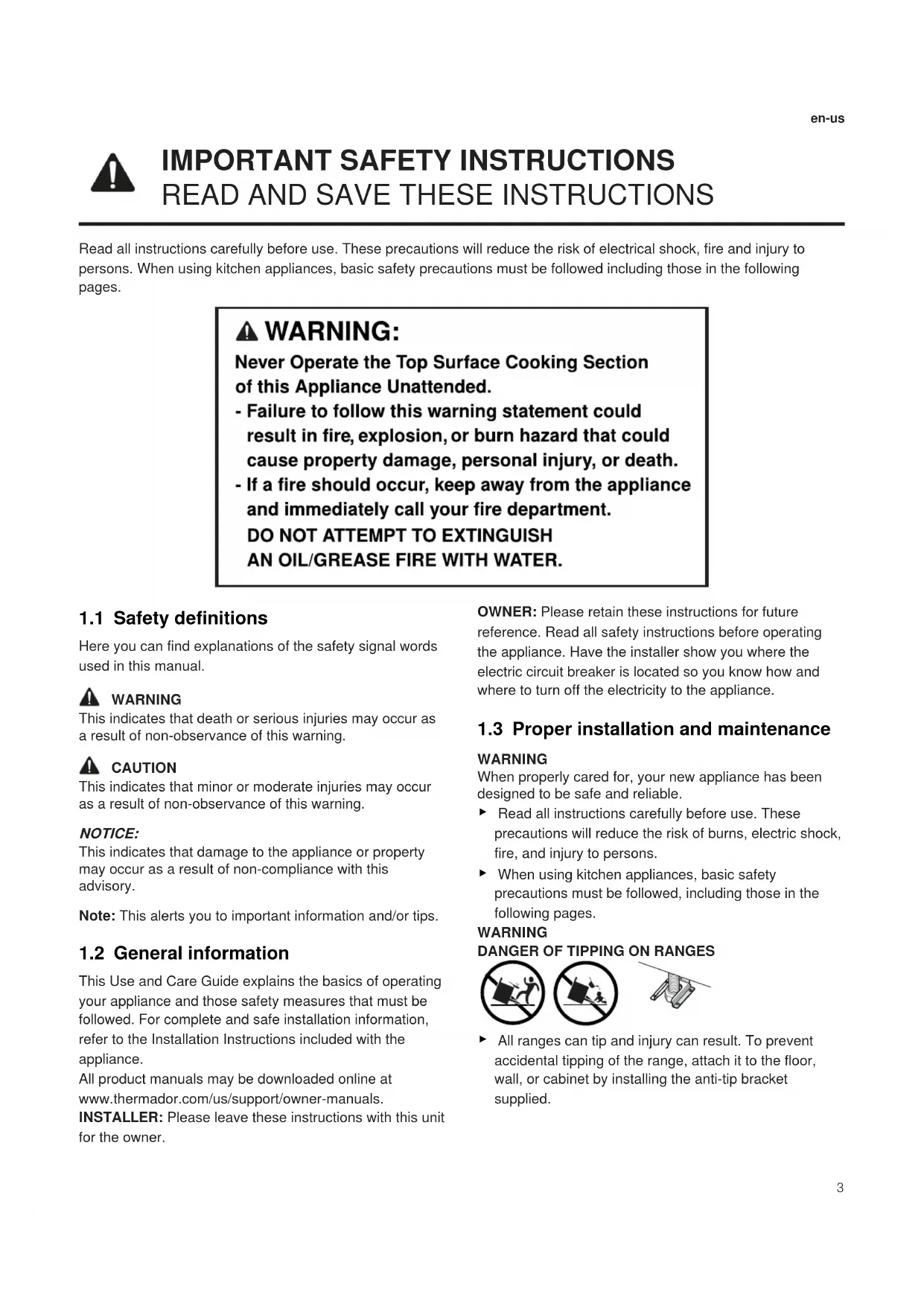 Read all instructions carefully before use. These precautions will reduce the risk of electrical shock, fire and injury to persons. When using kitchen appliances, basic safety precautions must be followed including those in the following pages. 1.1 Safety definitions Here you can find explanations of the safety signal words used in this manual. WARNING This indicates that death or serious injuries may occur as a result of non-observance of this warning. CAUTION This indicates that minor or moderate injuries may occur as a result of non-observance of this warning. NOTICE: This indicates that damage to the appliance or property may occur as a result of non-compliance with this advisory. Note:This alerts you to important information and/or tips. 1.2 General information This Use and Care Guide explains the basics of operating your appliance and those safety measures that must be followed. For complete and safe installation information, refer to the Installation Instructions included with the appliance. All product manuals may be downloaded online at www.thermador.com/us/support/owner-manuals. INSTALLER: Please leave these instructions with this unit for the owner. OWNER: Please retain these instructions for future reference. Read all safety instructions before operating the appliance. Have the installer show you where the electric circuit breaker is located so you know how and where to turn off the electricity to the appliance. 1.3 Proper installation and maintenance WARNING When properly cared for, your new appliance has been designed to be safe and reliable. ▶ Read all instructions carefully before use. These precautions will reduce the risk of burns, electric shock, fire, and injury to persons. ▶ When using kitchen appliances, basic safety precautions must be followed, including those in the following pages. WARNING
