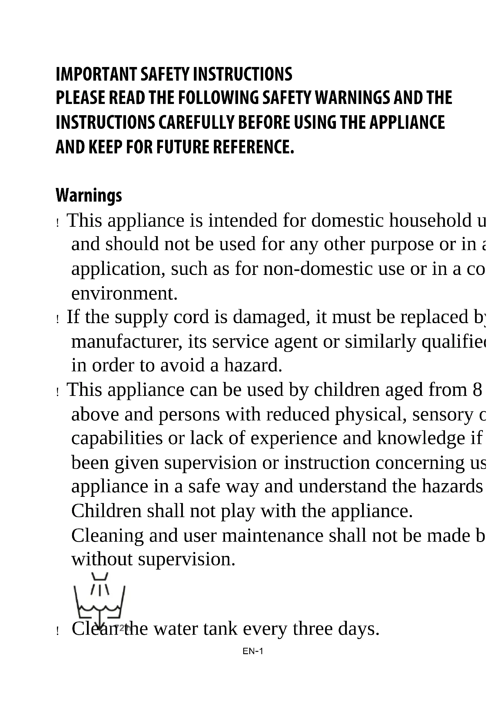 Do not exceed the maximum water level. It is recommended to use distilled water if you live in a hard water area.EN-8