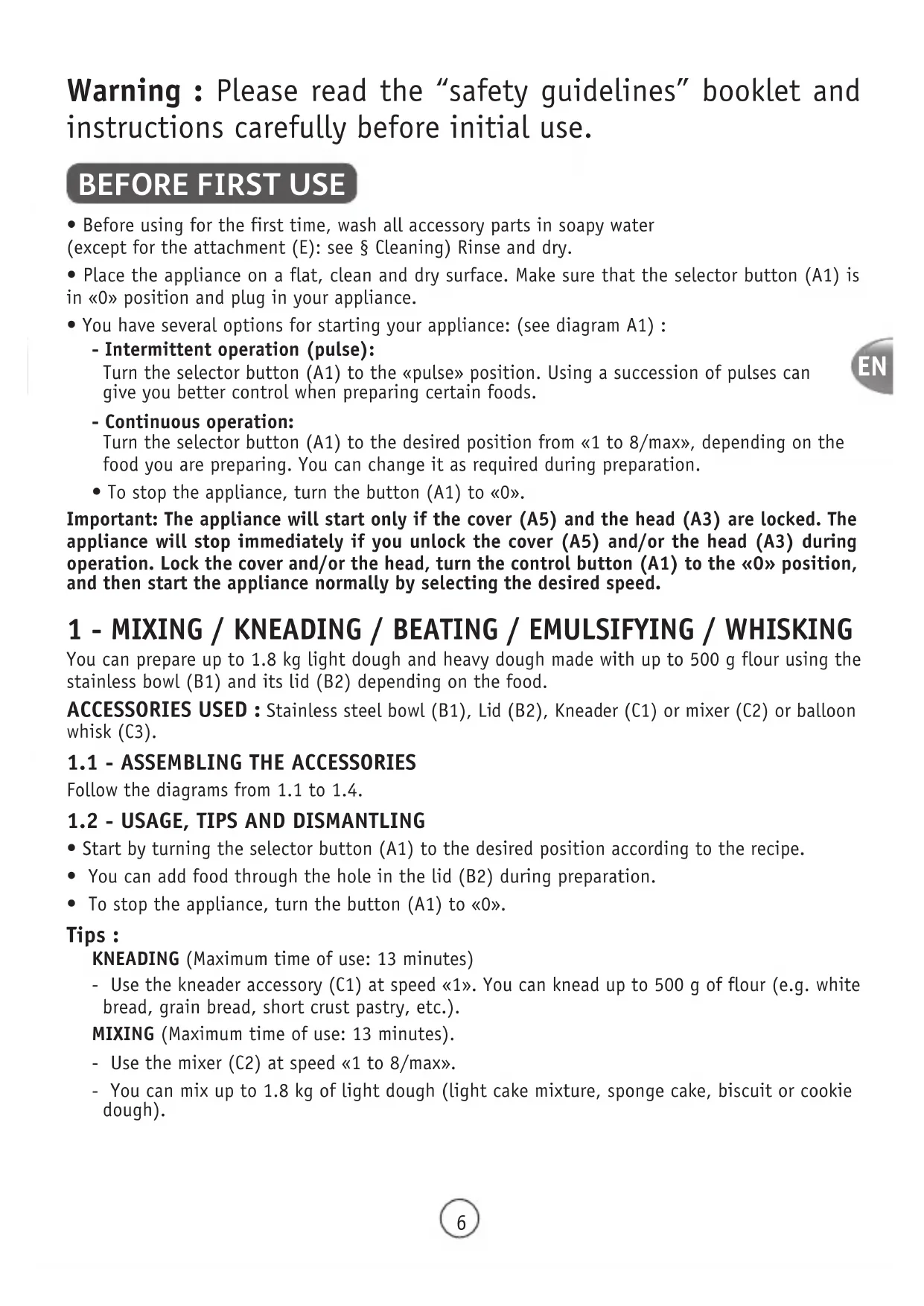 - Start by turning the selector button (A1) to the desired position according to the recipe.• You can add food through the hole in the lid (B2) during preparation.• To stop the appliance, turn the button (A1) to «0». Tips : KNEADING (Maximum time of use: 13 minutes)- Use the kneader accessory (C1) at speed «1». You can knead up to 500 g of flour (e.g. white bread, grain bread, short crust pastry, etc.).MIXING (Maximum time of use: 13 minutes).- Use the mixer (C2) at speed «1 to 8/max».- You can mix up to 1.8 kg of light dough (light cake mixture, sponge cake, biscuit or cookie dough).EN