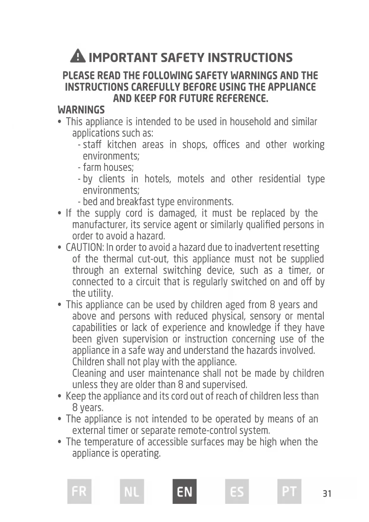 - Keep the appliance and its cord out of reach of children less than 8 years.