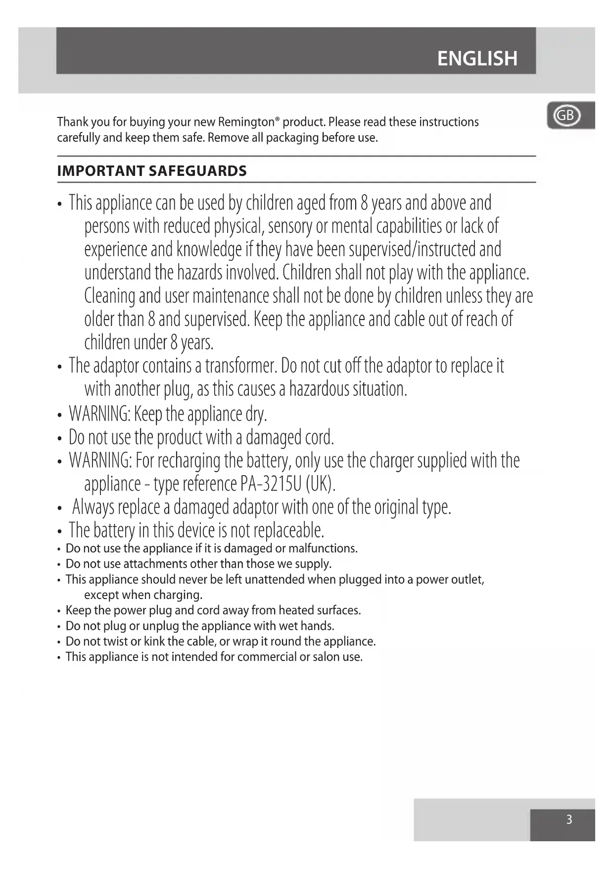ENGLISH Thank you for buying your new Remington® product. Please read these instructions carefully and keep them safe. Remove all packaging before use. IMPORTANT SAFEGUARDS