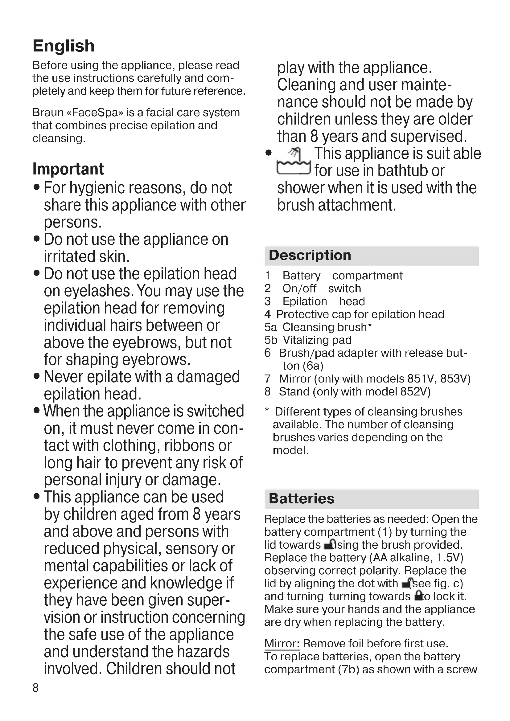 This appliance is suit able for use in bathtub or shower when it is used with the brush attachment. Description 1 Battery compartment 2 On/off switch 3 Epilation head 4 Protective cap for epilation head 5a Cleansing brush* 5b Vitalizing pad 6 Brush/pad adapter with release but- ton (6a) 7 Mirror (only with models 851V, 853V) 8 Stand (only with model 852V)