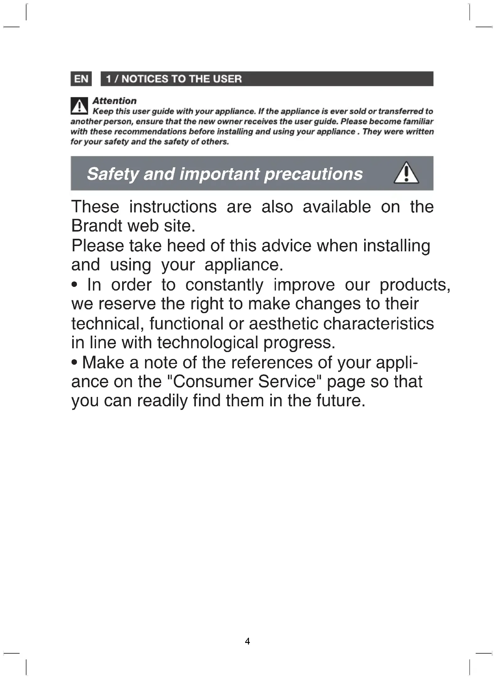 21Safety and important precautions These instructions are also available on the Brandt web site. Please take heed of this advice when installing and using your appliance.