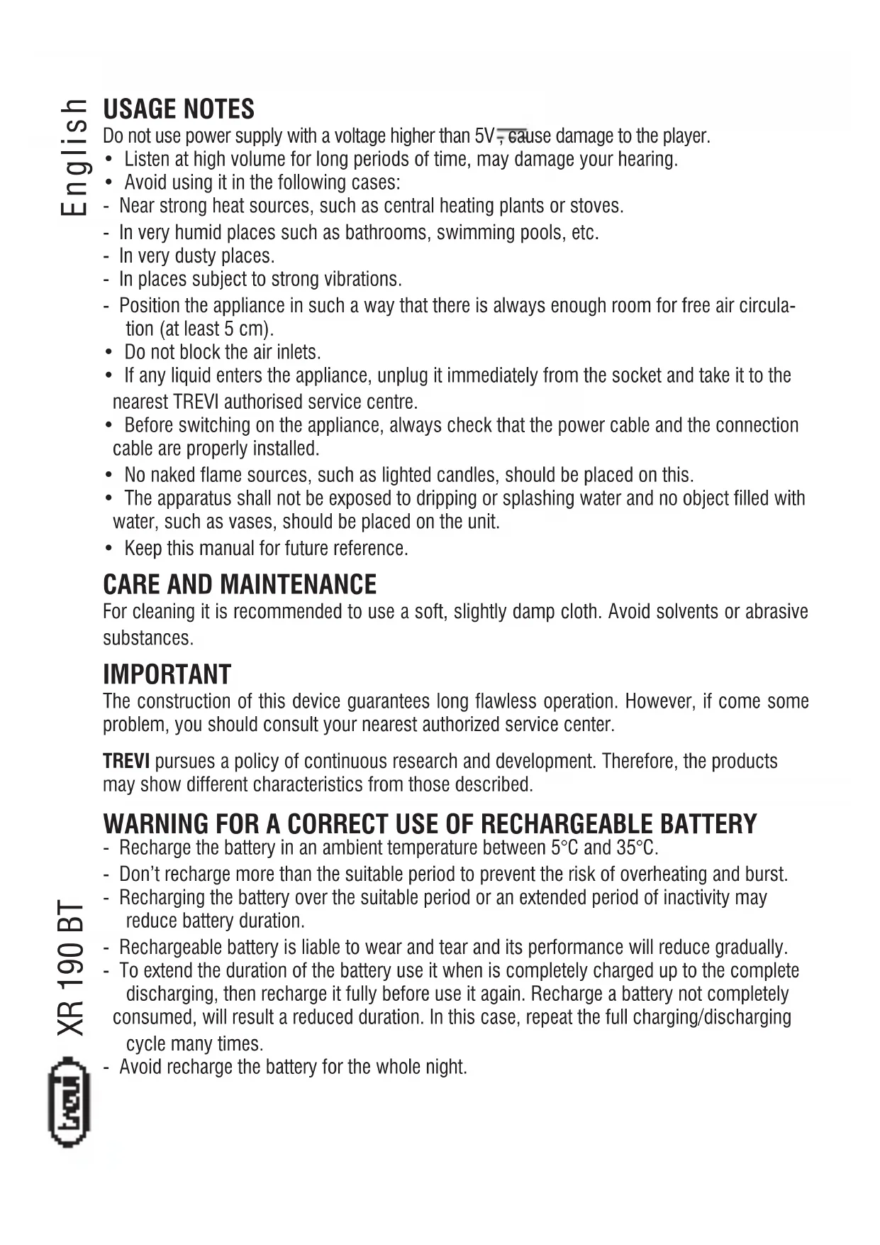 For cleaning it is recommended to use a soft, slightly damp cloth. Avoid solvents or abrasive substances. IMPORTANT The construction of this device guarantees long flawless operation. However, if come some problem, you should consult your nearest authorized service center. TREVI pursues a policy of continuous research and development. Therefore, the products may show different characteristics from those described. WARNING FOR A CORRECT USE OF RECHARGEABLE BATTERY - Recharge the battery in an ambient temperature between 5°C and 35°C. - Don’t recharge more than the suitable period to prevent the risk of overheating and burst. - Recharging the battery over the suitable period or an extended period of inactivity may reduce battery duration. - Rechargeable battery is liable to wear and tear and its performance will reduce gradually. - To extend the duration of the battery use it when is completely charged up to the complete discharging, then recharge it fully before use it again. Recharge a battery not completely consumed, will result a reduced duration. In this case, repeat the full charging/discharging cycle many times. - Avoid recharge the battery for the whole night. EnglishXR 190 BT English