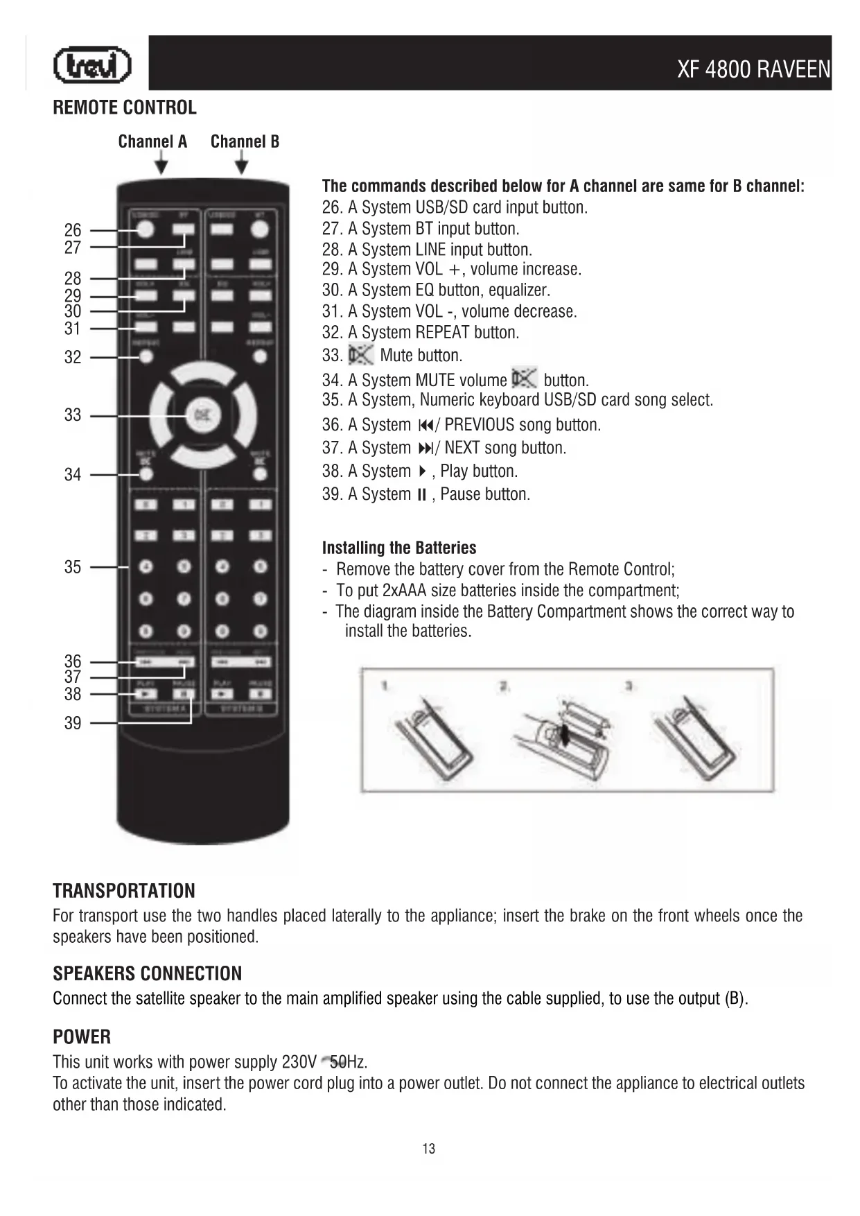 - The complete system is an amplified speaker with console and a second speaker. Caution:13 XF 4800 RAVEENGLISH REMOTE CONTROL The commands described below for A channel are same for B channel: