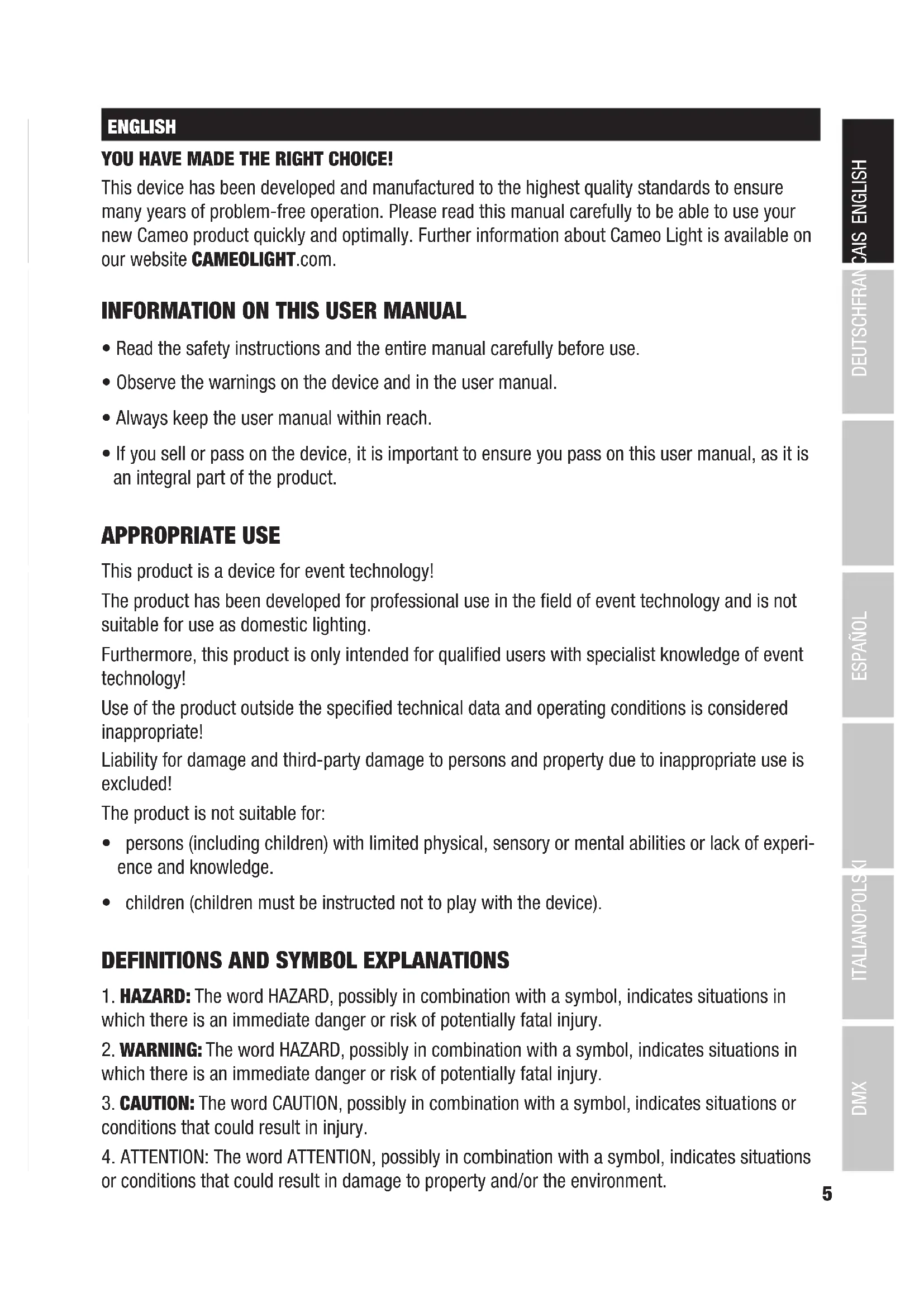 CONTENUTO5 DMX DEUTSCHFRANCAIS ESPAÑOL ENGLISH ITALIANO POLSKI ENGLISH YOU HAVE MADE THE RIGHT CHOICE! This device has been developed and manufactured to the highest quality standards to ensure many years of problem-free operation. Please read this manual carefully to be able to use your new Cameo product quickly and optimally. Further information about Cameo Light is available on our website CAMEOLIGHT.com.
