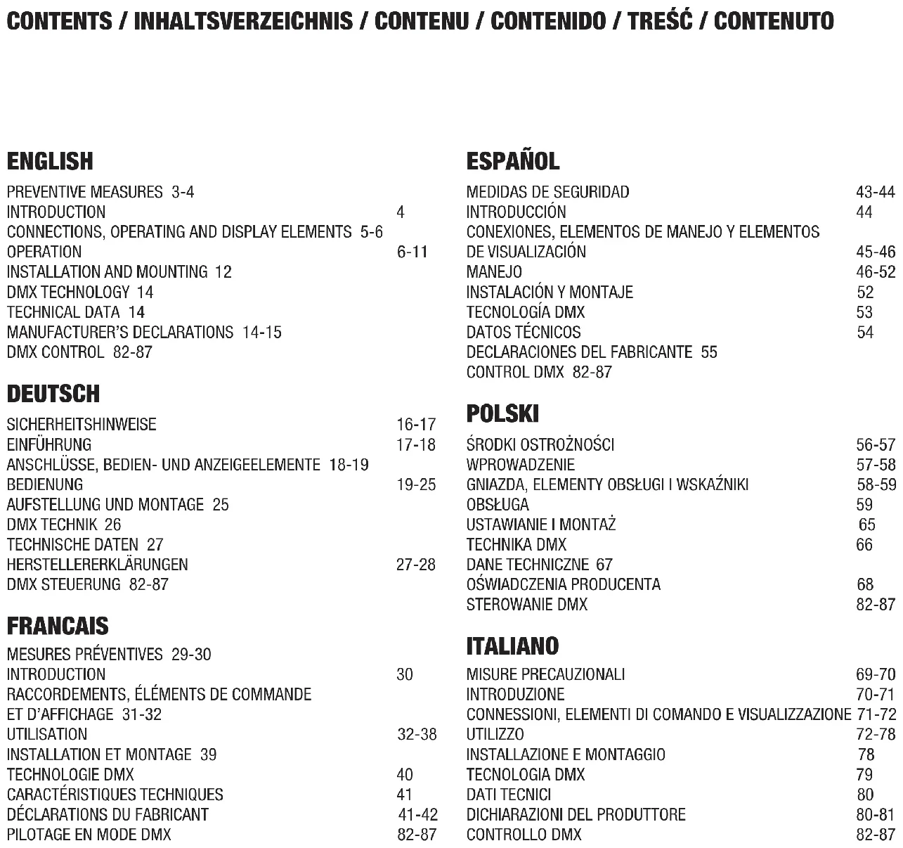 DMX DEUTSCHFRANCAIS ESPAÑOL ENGLISH ITALIANO POLSKI ENGLISH YOU‘VE MADE THE RIGHT CHOICE! We have designed this product to operate reliably over many years. Please read this User‘s Manual carefully, so that you can begin making optimum use of your Cameo Light product quickly. Learn more about Cameo Light on our website WWW.CAMEOLIGHT.COM. PREVENTIVE MEASURES