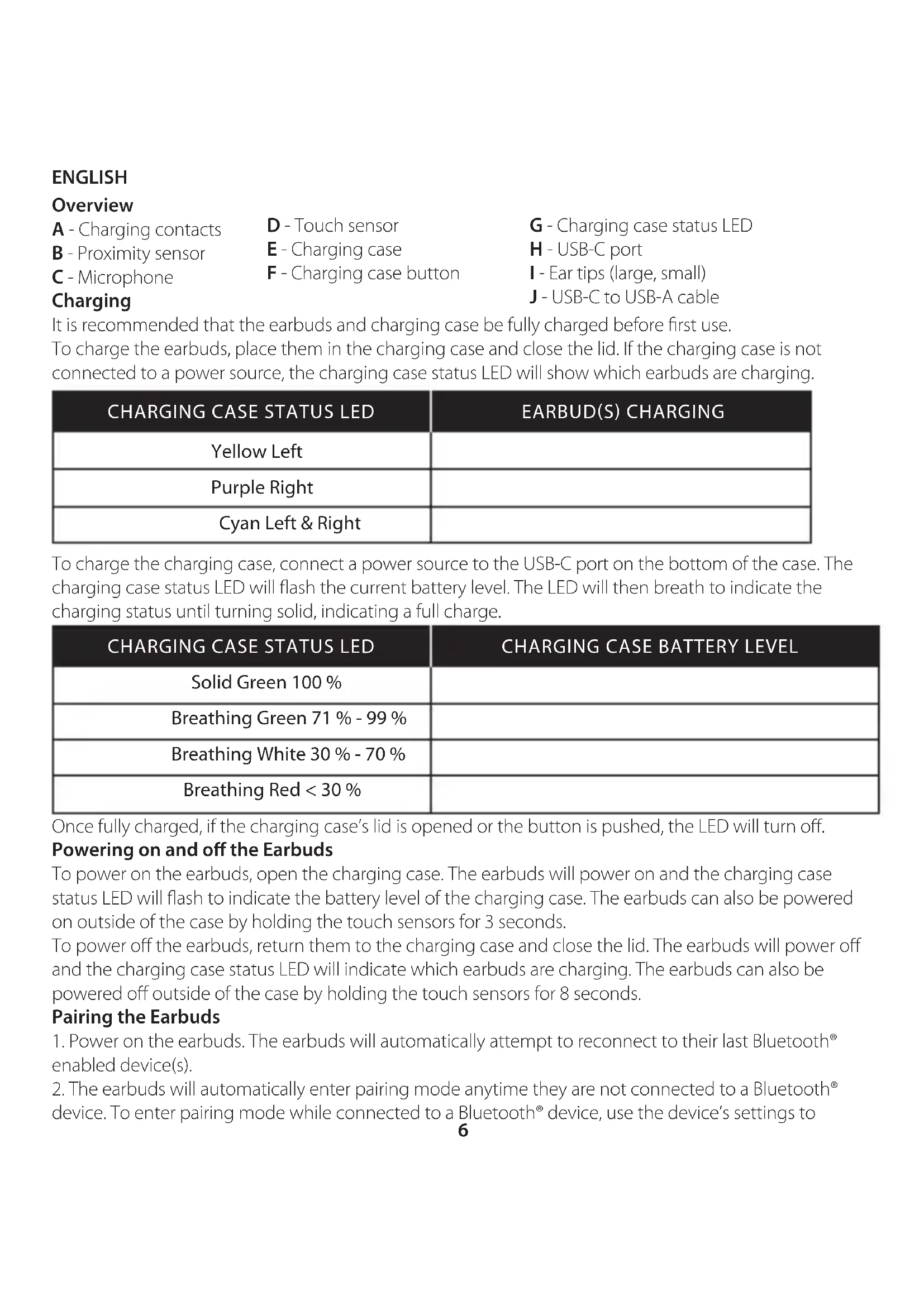 periods of time. ENGLISH Overview A - Charging contacts B - Proximity sensor C - Microphone Charging It is recommended that the earbuds and charging case be fully charged before rst use. To charge the earbuds, place them in the charging case and close the lid. If the charging case is not connected to a power source, the charging case status LED will show which earbuds are charging. To charge the charging case, connect a power source to the USB-C port on the bottom of the case. The charging case status LED will ash the current battery level. The LED will then breath to indicate the charging status until turning solid, indicating a full charge. Once fully charged, if the charging case’s lid is opened or the button is pushed, the LED will turn o. Powering on and o the Earbuds To power on the earbuds, open the charging case. The earbuds will power on and the charging case status LED will ash to indicate the battery level of the charging case. The earbuds can also be powered on outside of the case by holding the touch sensors for 3 seconds. To power o the earbuds, return them to the charging case and close the lid. The earbuds will power o and the charging case status LED will indicate which earbuds are charging. The earbuds can also be powered o outside of the case by holding the touch sensors for 8 seconds. Pairing the Earbuds
