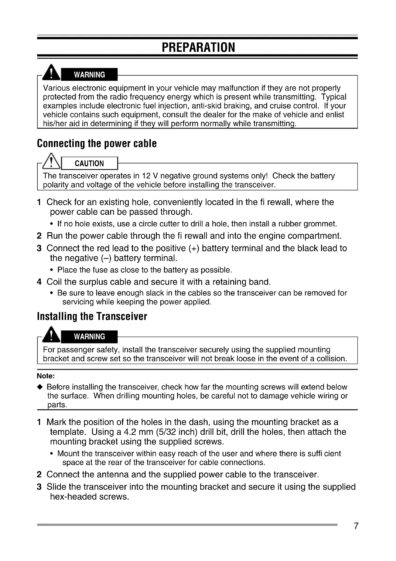- Microphone hanger (with 4 x 16 mm self-tapping screws) . . . . . . . . . . . . . . . . . . . . 1 User guide . . . . . . . . . . . . . . . . . . . . . . . . . . . . . . . . . . . . . . . . . . . . . . . . . . . . 17 PREPARATION WARNING Various electronic equipment in your vehicle may malfunction if they are not properly protected from the radio frequency energy which is present while transmitting. Typical examples include electronic fuel injection, anti-skid braking, and cruise control. If your vehicle contains such equipment, consult the dealer for the make of vehicle and enlist his/her aid in determining if they will perform normally while transmitting. Connecting the power cable CAUTION The transceiver operates in 12 V negative ground systems only! Check the battery polarity and voltage of the vehicle before installing the transceiver. 1 Check for an existing hole, conveniently located in the fi rewall, where the power cable can be passed through.