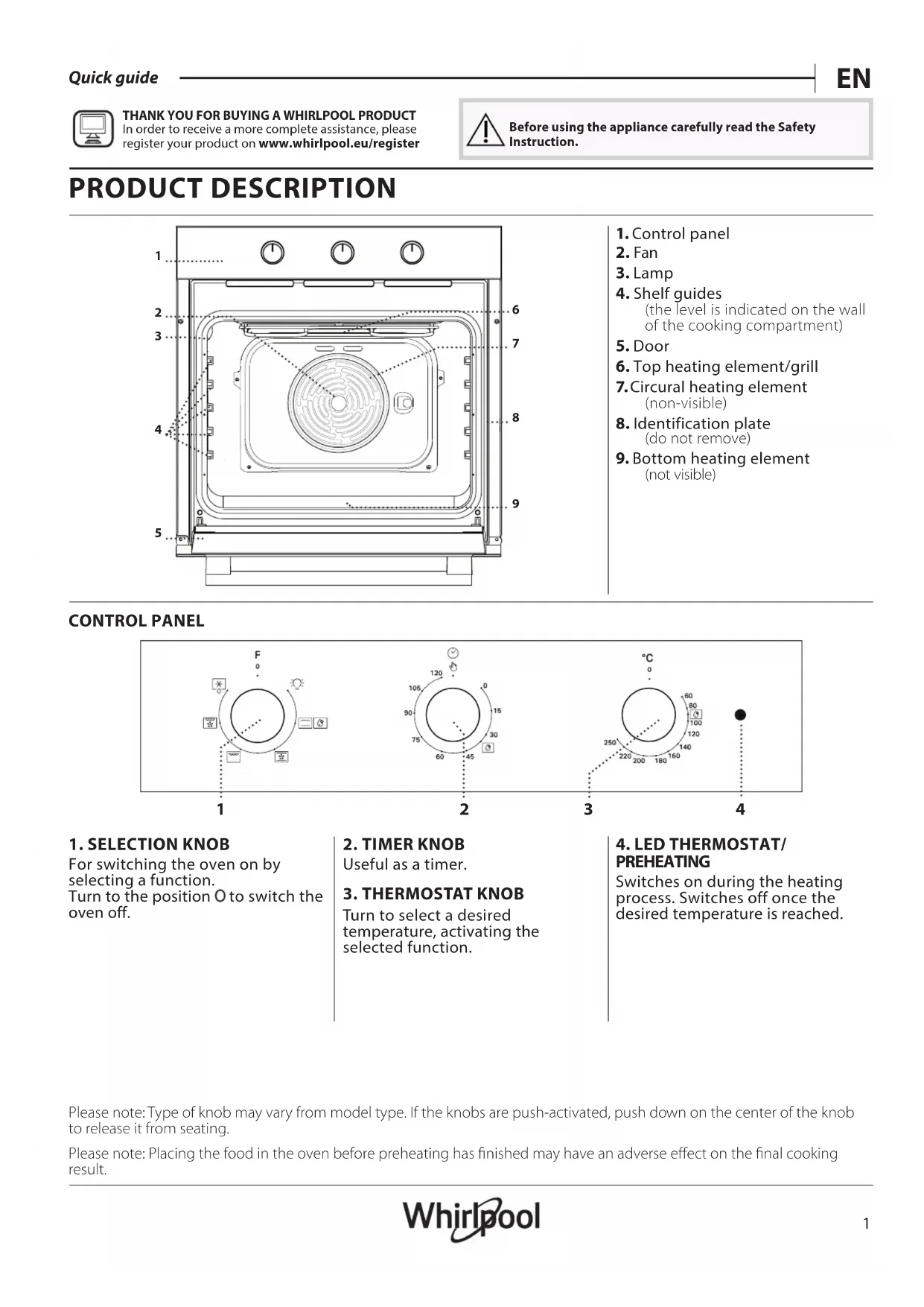 Quick guide THANK YOU FOR BUYING A WHIRLPOOL PRODUCT In order to receive a more complete assistance, please register your product on www . whirlpool . eu/ register Before using the appliance carefully read the Safety Instruction. PRODUCT DESCRIPTION CONTROL PANEL