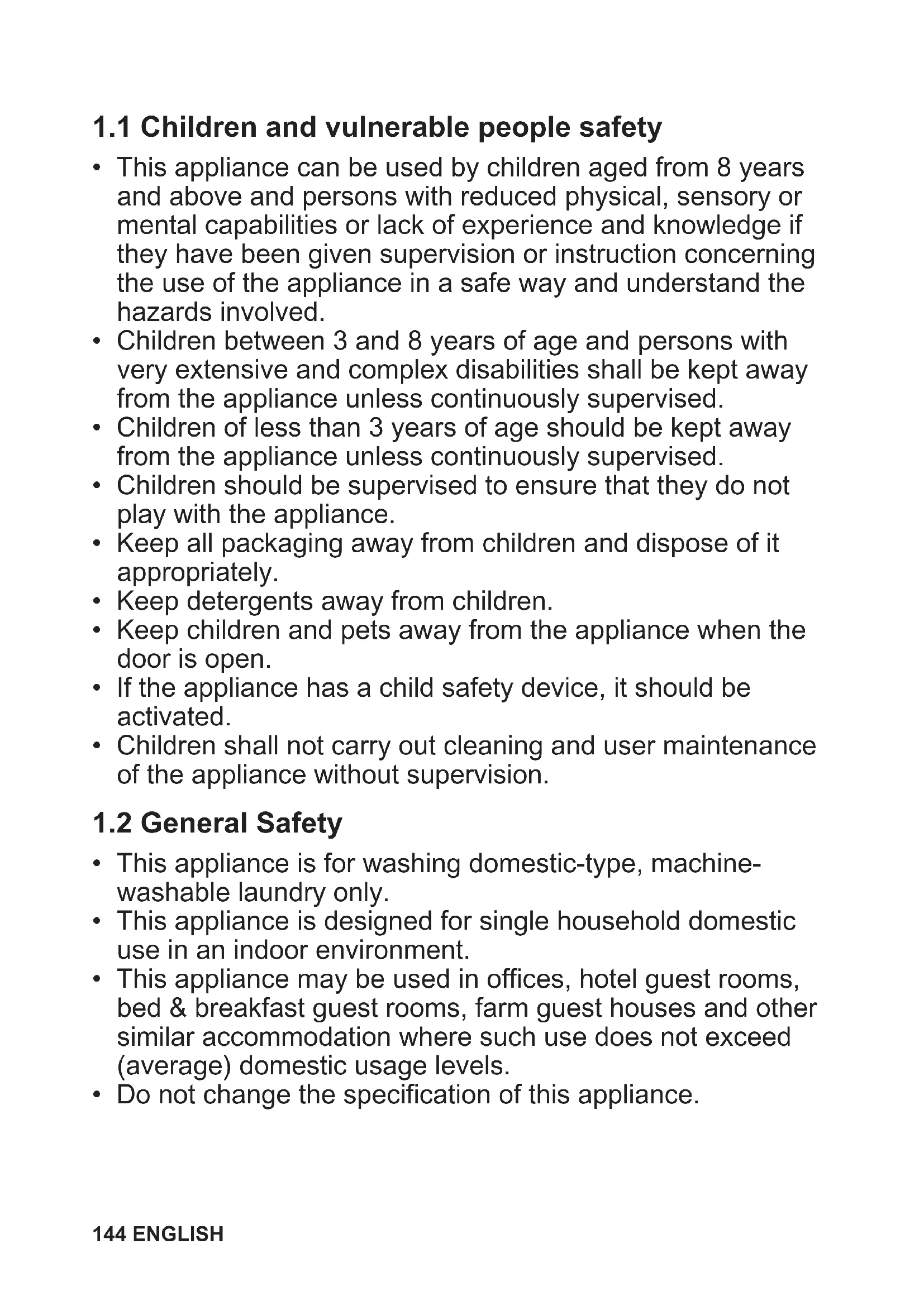 - Do not change the specification of this appliance. 144 ENGLISH• The appliance maximum load is 9.0 kg. Do not exceed the maximum load of each programme (refer to the “Programmes” chapter).