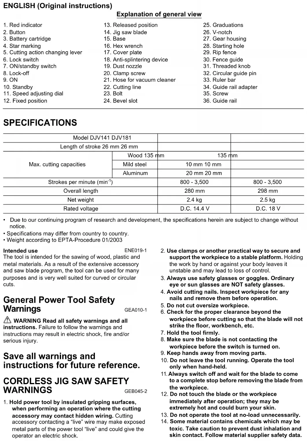 - Weight according to EPTA-Procedure 01/2003 Intended use ENE019-1 The tool is intended for the sawing of wood, plastic and metal materials. As a result of the extensive accessory and saw blade program, the tool can be used for many purposes and is very well suited for curved or circular cuts. General Power Tool Safety Warnings GEA010-1 WARNING Read all safety warnings and all instructions. Failure to follow the warnings and instructions may result in electric shock, fire and/or serious injury. Save all warnings and instructions for future reference.