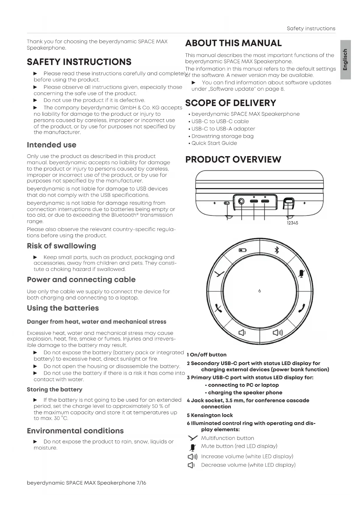 WARRANTY CONDITIONS ..............................14 TRADEMARKS .........................................14 FCC / IC REGULATION ..................................14Safety inructions beyerdynamic SPACE MAX Speakerphone 7/16 Thank you for choosing the beyerdynamic SPACE MAX Speakerphone. SAFETY INSTRUCTIONS ► Please read these inructions carefully and completely before using the product. ► Please observe all inructions given, especially those concerning the safe use of the product. ► Do not use the product if it is defective. ► The company beyerdynamic GmbH & Co. KG accepts no liability for damage to the product or injury to persons caused by careless, improper or incorrect use of the product, or by use for purposes not specified by the manufacturer. Intended use Only use the product as described in this product manual. beyerdynamic accepts no liability for damage to the product or injury to persons caused by careless, improper or incorrect use of the product, or by use for purposes not specified by the manufacturer. beyerdynamic is not liable for damage to USB devices that do not comply with the USB specifications. beyerdynamic is not liable for damage resulting from connection interruptions due to batteries being empty or too old, or due to exceeding the Bluetooth® transmission range. Please also observe the relevant country-specific regula- tions before using the product. Risk of swallowing ► Keep small pas, such as product, packaging and accessories, away from children and pets. They coni- tute a choking hazard if swallowed. Power and connecting cable Use only the cable we supply to connect the device for both charging and connecting to a laptop. Using the batteries Danger from heat, water and mechanical ress Excessive heat, water and mechanical ress may cause explosion, heat, fire, smoke or fumes. Injuries and irrevers- ible damage to the battery may result. ► Do not expose the battery (battery pack or integrated battery) to excessive heat, direct sunlight or fire. ► Do not open the housing or disassemble the battery. ► Do not use the battery if there is a risk it has come into contact with water. Storing the battery ► If the battery is not going to be used for an extended period, set the charge level to approximately 50% of the maximum capacity and ore it at temperatures up to max. 30°C. Environmental conditions ► Do not expose the product to rain, snow, liquids or moiure.
