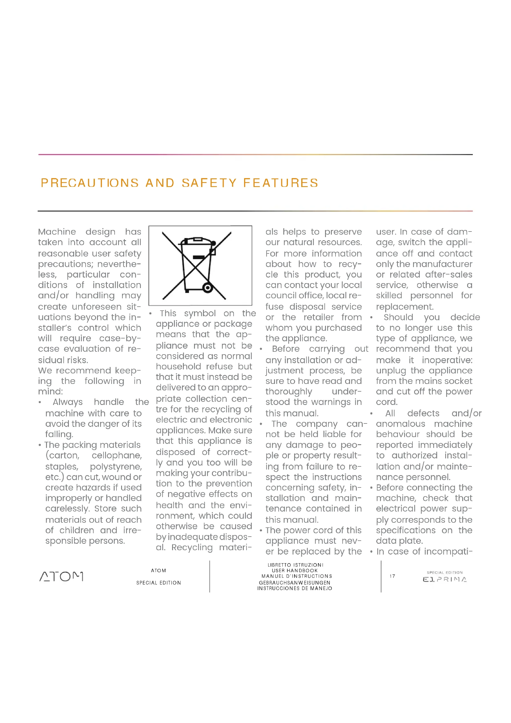 - Good cleaning and maintenance also contribute to deter- mining long machine life.ATOM SPECIAL EDITION LIBRETTO ISTRUZIONI USER HANDBOOK