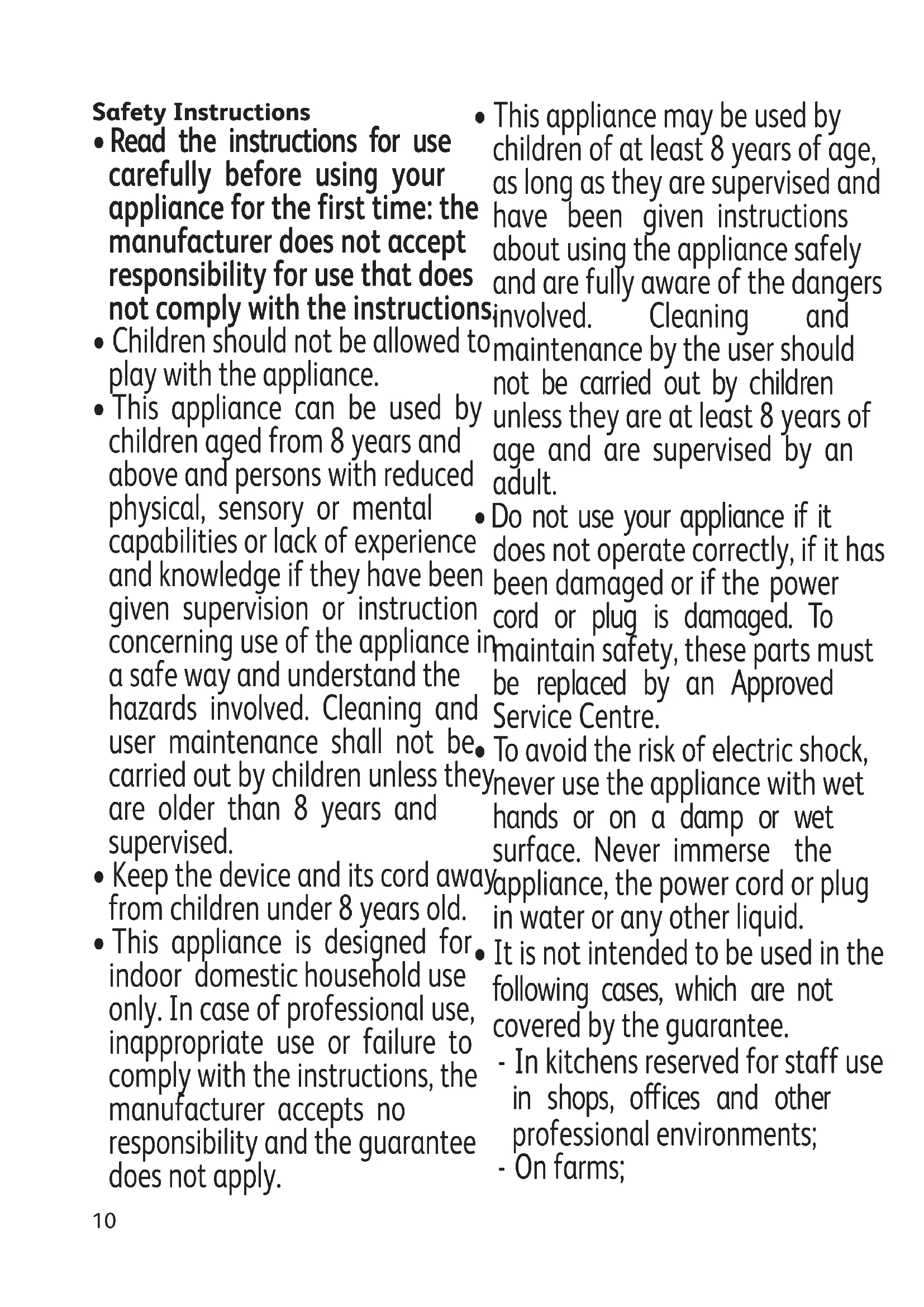 - Read the instructions for use carefully before using your appliance for the first time: the manufacturer does not accept responsibility for use that does not comply with the instructions.