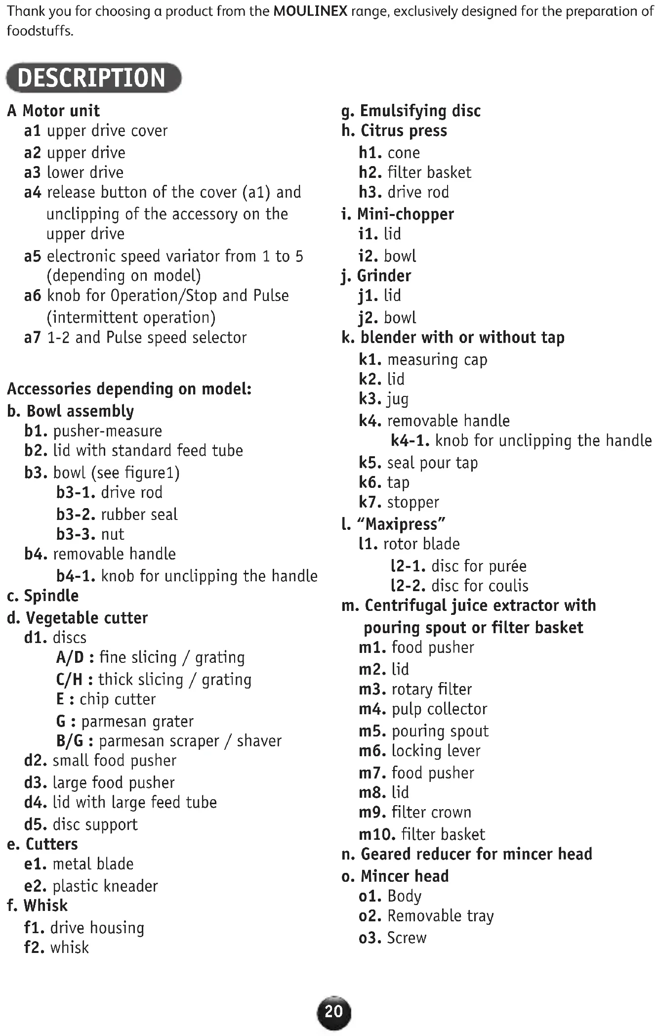 - when the bowl assembly (b) or the mincer geared reducer (n) are used, that the upper drive cover (a1) is correctly closed. Your appliance will still not operate? Contact an approved Moulinex service centre (see list in the “Moulinex Service” manual). You can personalise your appliance and obtain from your usual dealer or an approved MOULINEX service centre the following accessories: Moulinex approved accessory Service centre IF YOUR APPLIANCE WILL NOT OPERATE, WHAT SHOULD YOU DO? ACCESSORIES Stainless steel chip cutter disc (disc E) Stainless steel grater disc (disc G) Stainless steel parmesan shaving / scraping disc (disc B/G) Stainless steel thick slicing / grating disc (disc C/H) Stainless steel thin slicing / grating disc (disc A/D) Mini-chopper Grinder Blender Blender with tap Transparent bowl assembly Metal blade Plastic kneader Whisk Emulsifier Citrus press Maxipress (only for electronic version) Centrifugal juice extractor with pouring spout Centrifugal juice extractor with filter basket Spatula Mincer assembly