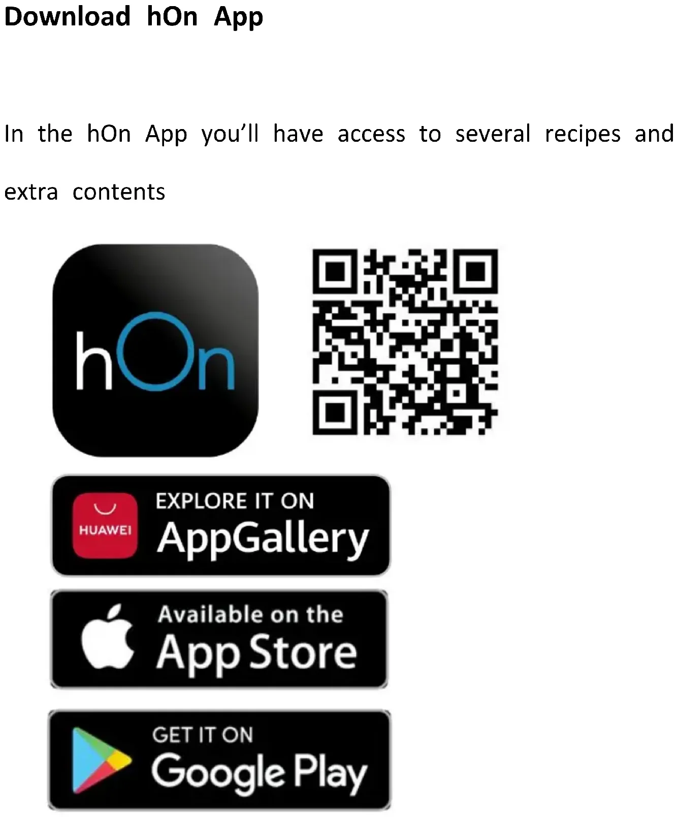 The cable must be checked regularly and only replaced by a proper qualified person.26 DISPOSAL: Do not dispose this product as unsorted municipal waste. Collection of such waste separately for special treatment is necessary. This appliance is labeled in compliance with European directive 2012/19/EU for Waste Electrical and Electronic Equipment (WEEE). By ensuring that this appliance is disposed of correctly, you will help prevent any possible damage to the environment and to human health, which might otherwise be caused if it were disposed of in the wrong way. The symbol on the product indicates that it may not be treated as normal household waste. It should be taken to a collection point for the recycling of electrical and electronic goods. This appliance requires specialist waste disposal. For further information regarding the treatment, recover and recycling of this product please contact your local council, your household waste disposal service, or the shop where you purchased it. For more detailed information about treatment, recovery and recycling of this product, please contact your local city office, your household waste disposal service or the shop where you purchased the product.27 Téléchargez l’application hOn L’application hOn vous donne accès à de nombreuses recettes et contenus supplémentaires28