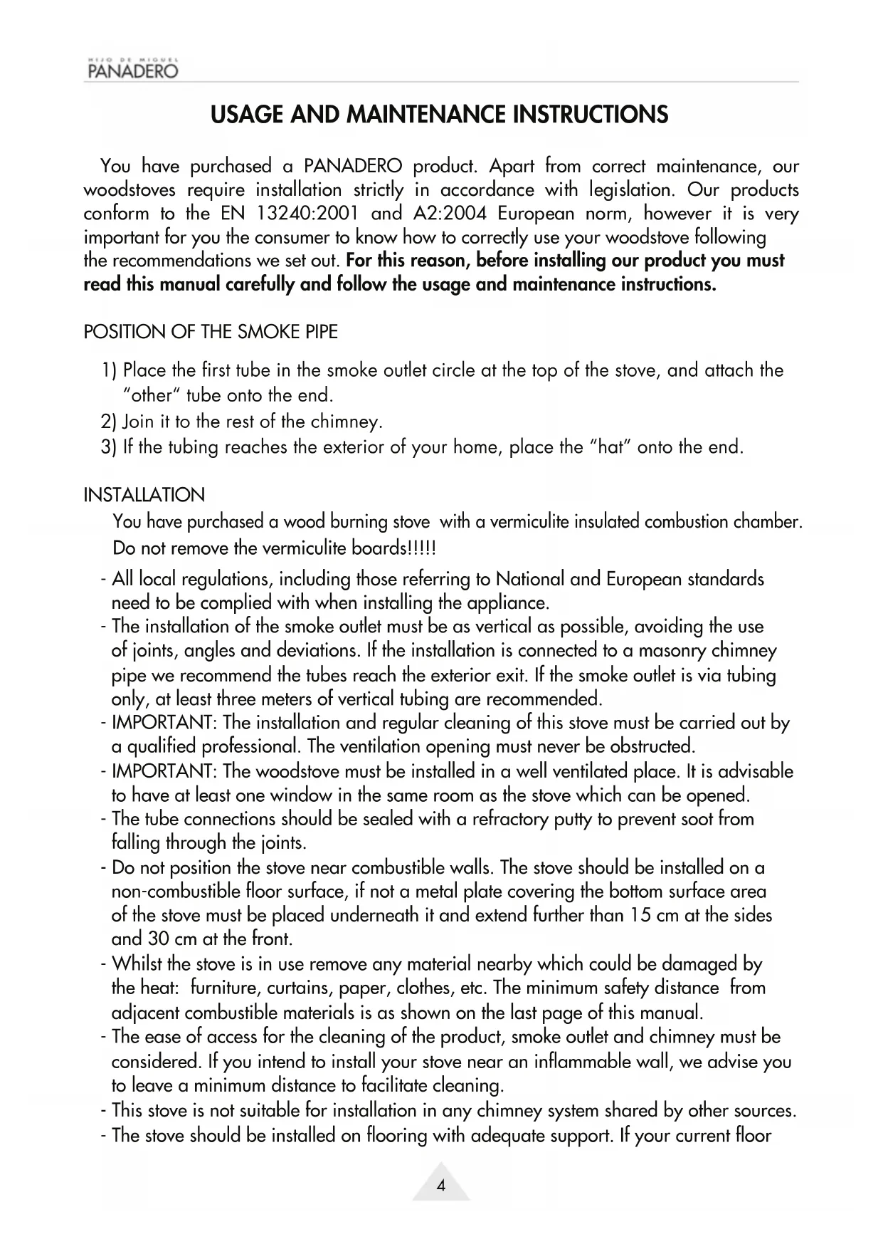 You have purchased a PANADERO product. Apart from correct maintenance, our woodstoves require installation strictly in accordance with legislation. Our products conform to the EN 13240:2001 and A2:2004 European norm, however it is very important for you the consumer to know how to correctly use your woodstove following the recommendations we set out. For this reason, before installing our product you must read this manual carefully and follow the usage and maintenance instructions.
