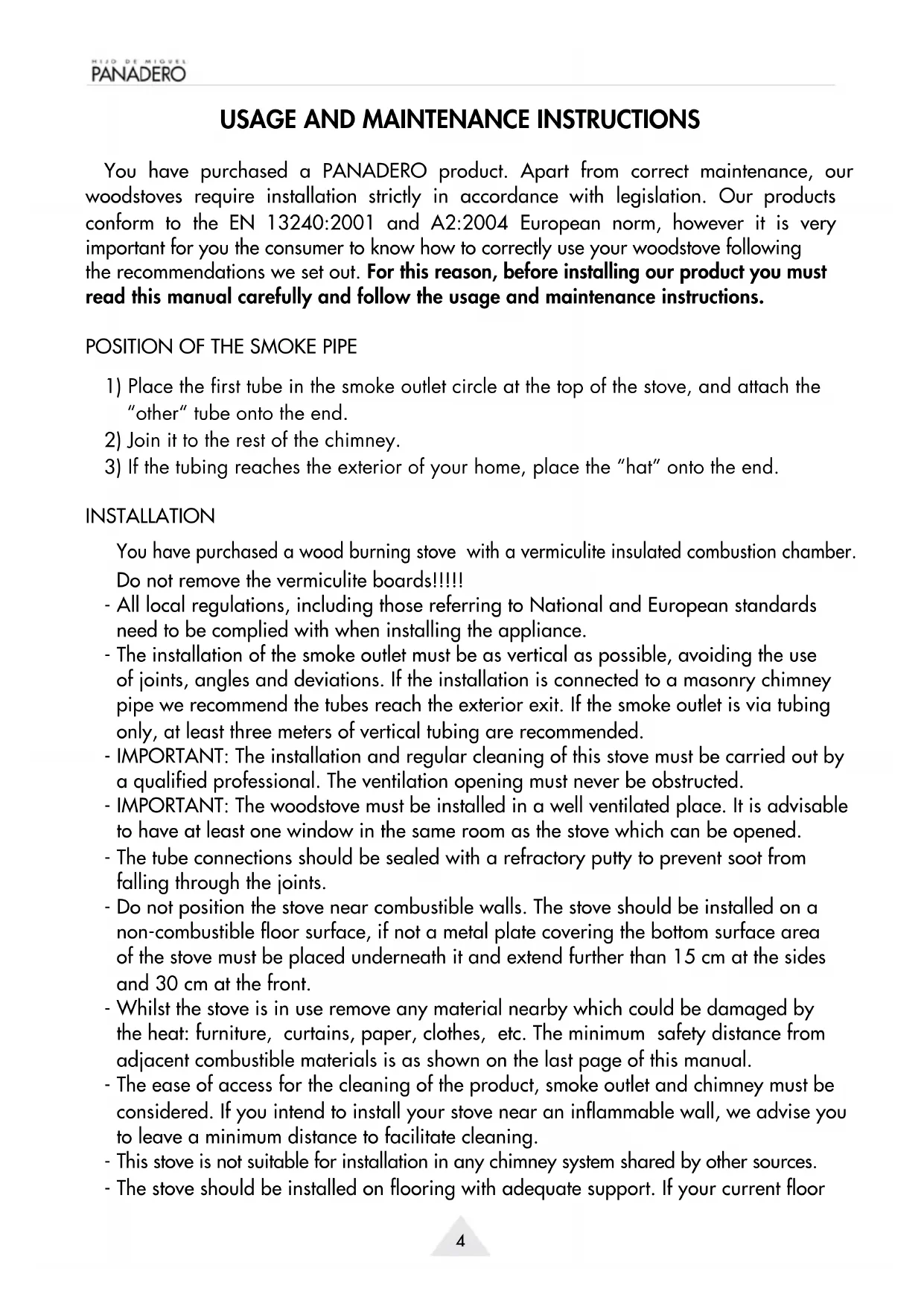 You have purchased a PANADERO product. Apart from correct maintenance, our woodstoves require installation strictly in accordance with legislation. Our products conform to the EN 13240:2001 and A2:2004 European norm, however it is very important for you the consumer to know how to correctly use your woodstove following the recommendations we set out. For this reason, before installing our product you must read this manual carefully and follow the usage and maintenance instructions.