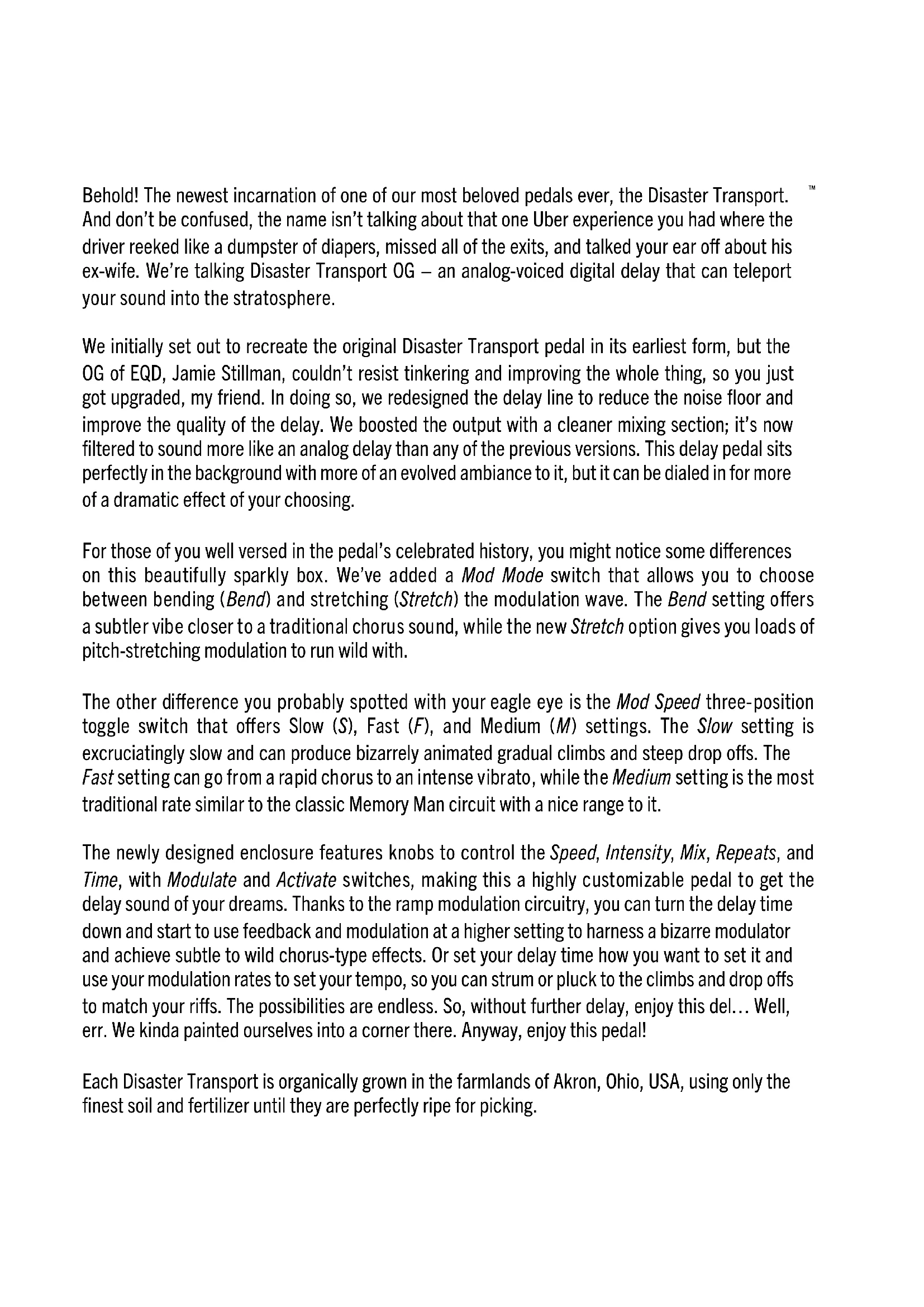 And don’t be confused, the name isn’t talking about that one Uber experience you had where the driver reeked like a dumpster of diapers, missed all of the exits, and talked your ear o about his ex-wife. We’re talking Disaster Transport OG – an analog-voiced digital delay that can teleport your sound into the stratosphere. We initially set out to recreate the original Disaster Transport pedal in its earliest form, but the OG of EQD, Jamie Stillman, couldn’t resist tinkering and improving the whole thing, so you just got upgraded, my friend. In doing so, we redesigned the delay line to reduce the noise floor and improve the quality of the delay. We boosted the output with a cleaner mixing section; it’s now filtered to sound more like an analog delay than any of the previous versions. This delay pedal sits perfectly in the background with more of an evolved ambiance to it, but it can be dialed in for more of a dramatic eect of your choosing. For those of you well versed in the pedal’s celebrated history, you might notice some dierences on this beautifully sparkly box. We’ve added a Mod Mode switch that allows you to choose between bending (Bend) and stretching (Stretch) the modulation wave. The Bend setting oers a subtler vibe closer to a traditional chorus sound, while the new Stretch option gives you loads of pitch-stretching modulation to run wild with. The other dierence you probably spotted with your eagle eye is the Mod Speed three-position toggle switch that oers Slow (S), Fast (F), and Medium (M) settings. The Slow setting is excruciatingly slow and can produce bizarrely animated gradual climbs and steep drop os. The Fast setting can go from a rapid chorus to an intense vibrato, while the Medium setting is the most traditional rate similar to the classic Memory Man circuit with a nice range to it. The newly designed enclosure features knobs to control the Speed, Intensity, Mix, Repeats, and Time, with Modulate and Activate switches, making this a highly customizable pedal to get the delay sound of your dreams. Thanks to the ramp modulation circuitry, you can turn the delay time down and start to use feedback and modulation at a higher setting to harness a bizarre modulator and achieve subtle to wild chorus-type eects. Or set your delay time how you want to set it and use your modulation rates to set your tempo, so you can strum or pluck to the climbs and drop os to match your ris. The possibilities are endless. So, without further delay, enjoy this del… Well, err. We kinda painted ourselves into a corner there. Anyway, enjoy this pedal! Each Disaster Transport is organically grown in the farmlands of Akron, Ohio, USA, using only the finest soil and fertilizer until they are perfectly ripe for picking.5 SPEED Controls the speed of the modulation. The Speed operates in three ranges (Slow/Fast/ Medium) selected by the Mod Speed toggle switch. The Disaster Transport OG uses a Ramp wave for the modulation. You’ll find this to be much more intense than most modulated delays. Think of it as a traditional Triangle wave that falls o a cli in mid-cycle, creating a drastic pitch bend in its wake. Or don’t and just think about whatever you want. INTENSITY Controls how much the LFO modulates the delay time. More subtle chorus type eects are achieved with less intensity and more intensity will yield wild pitch stretching and bending. The overall modulation style can be made more or less subtle by using the Mod Mode toggle switch to select Bend or Stretch. MIX Sets the volume level for the delay signal. Hear more of what you just played 30-600ms ago by turning this up. REPEATS Controls the intensity of delay feedback from no repeats at zero to self-oscillation at max. Let the past pile up on you until it implodes. TIME Sets the delay time from around 30ms at zero to 600ms at max. Everyone needs more time; all we can oer you is about 600ms worth. MOD SPEED Three position toggle switch that sets the range in which the Rate operates. MOD MODE Two position toggle switch to choose the modulation style. Bend is more of a traditional chorus type modulation and Stretch is a wilder pitch stretching modulation. MODULATE This footswitch features Flexi-Switch® Technology and turns the modulation on and o. ACTIVATE This footswitch features Flexi-Switch® Technology and turns the eect on and o.FLEXI-SWITCH