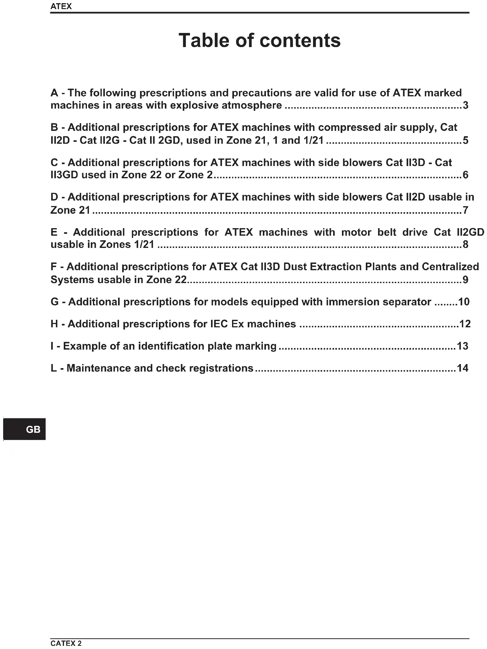 Nilsk Models: Motor + turbine belt drive system Standards of reference: These machines comply with: IEC 60079-0 standards CAUTION! Observe the prescriptions of the above standards. These machines are intended to be used in explosive atmospheres classied: Zones 21 and 22 (dusty environments), Zones 1 and 2 (areas with a presence of gas) and Zones Z1/21 and Z2/22 (areas with a presence of both dust and gas). Never use the vacuum cleaners in Zone 20 and/or 0 (areas with Flammable gases). These vacuum cleaners are designed to vacuum dry and wet particles and clean places and machines, especially in food, chemical, pharmaceutical, textile industries, and they are suitable for collective use in hotels, schools, hospitals, factories, shops, oces and residences. They are not designed to be used for ST3 explosion class dust, that is to say dust with value of Kst > 300 bar m/s (ISO 6184/1 – IFA classication: http://staubex.ifa.dguv. de/?lang=e), nor dust with an ignition energy lower than 1 mJ. For these applications please refer to paragraph G - Additional prescriptions for models equipped with immersion separator. These machines not designed for vacuuming explosive or chemically unstable materials. They are meant for environments with presence of gas up to the IIB Group (Ethylene). They are not designed to vacuum uids with a low ash point (Flash Point lower than 55°C), nor for incendiary substances (T < 200 °C). For these models, apart from following the instructions in the use and maintenance manual of the standard vacuum cleaner, specic precautions and maintenance are also required. Identication plate marking: Ex IIB T4 Gb - Ex IIIC T125°C Db (See marking example in paragraph I). The motor and turbine ball bearings and the transmission belt must be serviced by a Nilsk Service Center every 10,000 working hours or every 2 years. Contact the sales network or the machine manufacturer. The operator must not dismantle, tamper with and/or service the turbines. This machine has an antistatic transmission belt. In case of breakage, only use original Nilsk spare parts. Any parts that need replacing must be replaced by trained personnel. Follow the instructions in the basic use and maintenance manual to check the belt tension Turbine corrosion can be a real danger. The turbines of these machines are made of aluminium alloy and galvanized steel. Do not vacuum gases, vapours and/or uids that can corrode these metals. Depending on the quantity of dust present in the area or, in any case, every six months, clean the motor plate regularly so as to remove any dust deposit. Check the transmission belt tension and wear and, if necessary, replace it with an original spare part. CAUTION! On all machines supplied without an electrical plug, the user must connect the free end of the cable in a non-explosive atmosphere, in a housing or using a plug protected by a mode recognized as suitable for the area of destination. The plug shall be installed by a qualied electrician only. CAUTION! In case of bearing noise, stop the machine immediately and check the bearings. Contact the After-Sales Service Center for the above maintenance operations. Do not start the machine again, as this could cause an explosion! All the above prescriptions, precautions and service operations must be observed, or Nilsk Warranty for compliance with IEC Ex requirements will become void, Nilsk Conformity Certicate will become void and the User will be entirely responsible for the use of the vacuum cleaner. CAUTION! All maintenance and cleaning operations must be carried out when the machine is o and disconnected from the electrical mains. CAUTION! The special conditions for safe use are complemented by those described in the certicates of conformity of each equipment constitutive of the nal assembly. H - Additional prescriptions for IEC Ex machinesATEX 13 CATEX