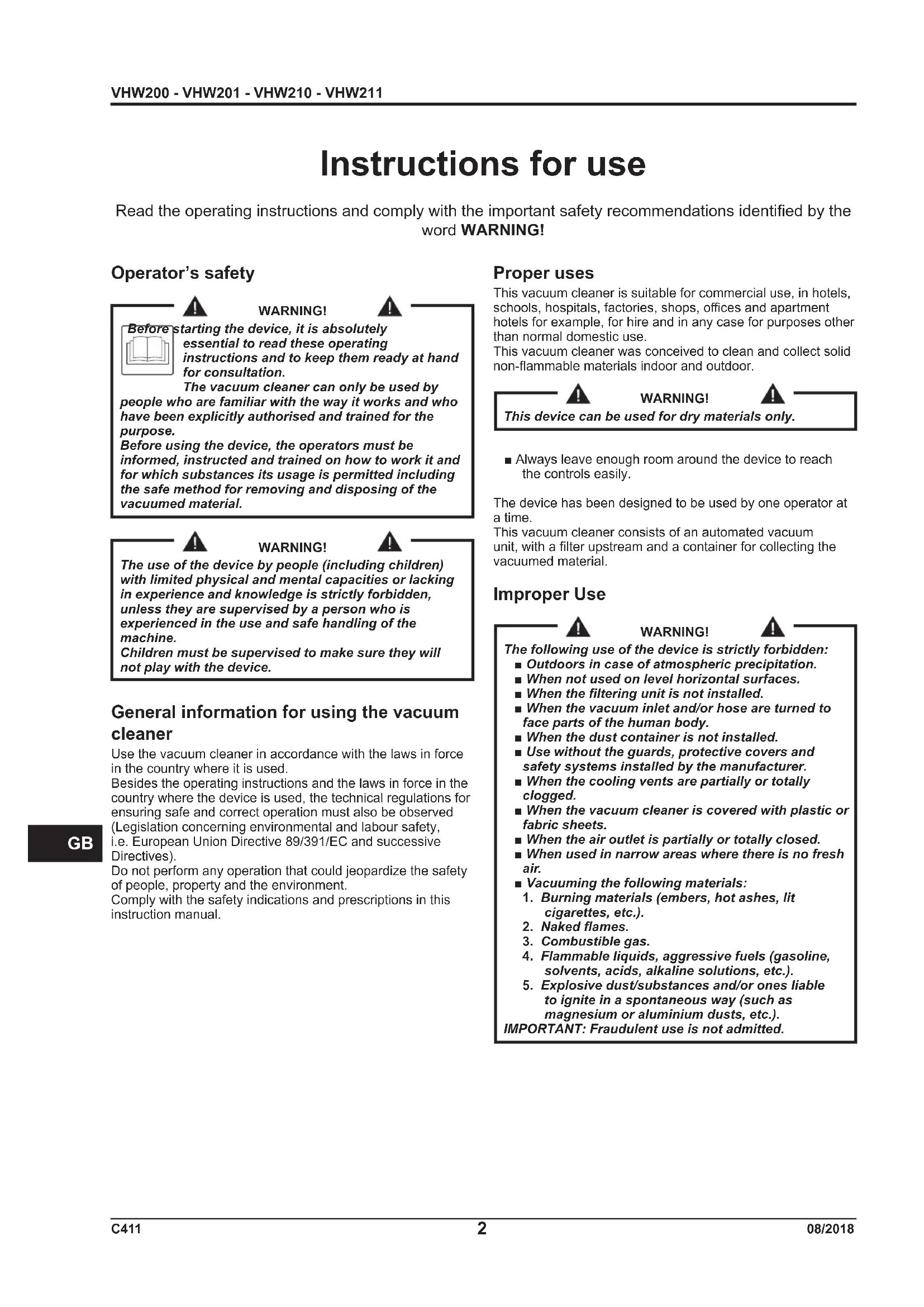 ) 1.5 WARNING! Sockets, plugs, cable clamps, connectors and installation of the extension cable must maintain the IP protection degree of the vacuum cleaner, as indicated on the data plate. WARNING! The vacuum cleaners are safe only if equipped with a circuit breaker protection. Otherwise there is a risk of electric shock and re. WARNING! The vacuum cleaner’s power socket must be protected by a dierential circuit-breaker with surge current limitation, that shuts o the power supply when the current discharged to the ground exceeds 30 mA for 30 msec. or an equivalent protection circuit. WARNING! Never spray water on the vacuum cleaner: this could be dangerous for persons and could short circuit the power supply. WARNING! Comply with the safety regulations governing the materials for which the vacuum cleaner is used. Dry applications [ NOTE ] The supplied lters and the bag (if applicable) must be installed correctly. WARNING! Comply with the safety regulations governing the materials for which the vacuum cleaner is used. Maintenance and repairs WARNING! Disconnect the vacuum cleaner from its power source before cleaning, servicing or replacing parts; the vacuum cleaner cable plug/terminals must be removed from the power source. ■ Carry out only the maintenance operations described in this manual. ■ Use only original spare parts. ■ Do not modify the vacuum cleaner in any way. Failure to comply with these instructions could jeopardize your safety. Moreover, such action would immediately void the EC declaration of conformity/ incorporation issued with the device.VHW200 - VHW201 - VHW210 - VHW211 08/2018