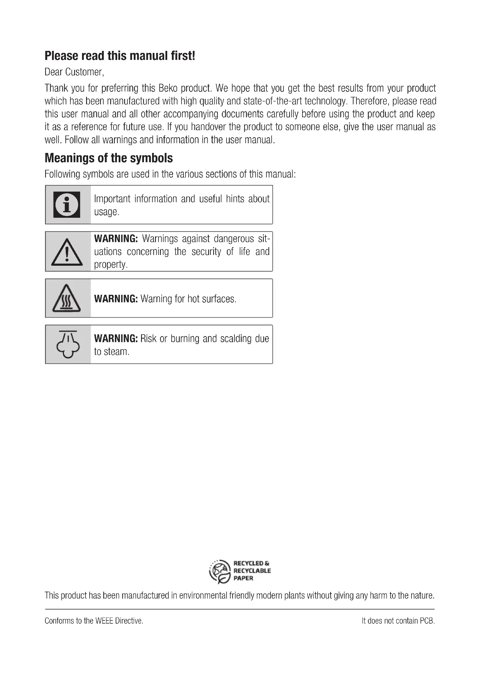 1Please read this manual first! Dear Customer, Thank you for preferring this Beko product. We hope that you get the best results from your product which has been manufactured with high quality and state-of-the-art technology. Therefore, please read this user manual and all other accompanying documents carefully before using the product and keep it as a reference for future use. If you handover the product to someone else, give the user manual as well. Follow all warnings and information in the user manual. Meanings of the symbols Following symbols are used in the various sections of this manual: