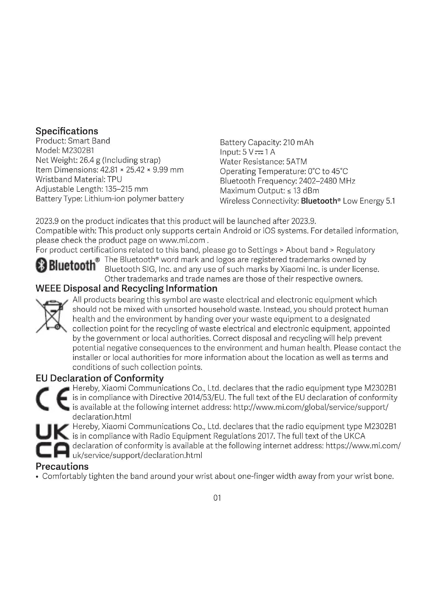 Mi Fitness Mi FitnessSpecifications Product: Smart Band Model: M2302B1 Net Weight: 26.4 g (Including strap) Item Dimensions: 42.81×25.42×9.99 mm Wristband Material: TPU Adjustable Length: 135–215 mm Battery Type: Lithium-ion polymer battery Battery Capacity: 210 mAh Input: 5 V 1 A Water Resistance: 5ATM Operating Temperature: 0°C to 45°C Bluetooth Frequency: 2402–2480 MHz Maximum Output: ≤ 13 dBm Wireless Connectivity: Bluetooth® Low Energy 5.1 2023.9 on the product indicates that this product will be launched after 2023.9. Compatible with: This product only supports certain Android or iOS systems. For detailed information, please check the product page on www.mi.com . For product certifications related to this band, please go to Settings > About band > Regulatory The Bluetooth® word mark and logos are registered trademarks owned by Bluetooth SIG, Inc. and any use of such marks by Xiaomi Inc. is under license. Other trademarks and trade names are those of their respective owners. WEEE Disposal and Recycling Information All products bearing this symbol are waste electrical and electronic equipment which should not be mixed with unsorted household waste. Instead, you should protect human health and the environment by handing over your waste equipment to a designated collection point for the recycling of waste electrical and electronic equipment, appointed by the government or local authorities. Correct disposal and recycling will help prevent potential negative consequences to the environment and human health. Please contact the installer or local authorities for more information about the location as well as terms and conditions of such collection points. EU Declaration of Conformity Hereby, Xiaomi Communications Co., Ltd. declares that the radio equipment type M2302B1 is in compliance with Directive 2014/53/EU. The full text of the EU declaration of conformity is available at the following internet address: http://www.mi.com/global/service/support/ declaration.html Hereby, Xiaomi Communications Co., Ltd. declares that the radio equipment type M2302B1 is in compliance with Radio Equipment Regulations 2017. The full text of the UKCA declaration of conformity is available at the following internet address: https://www.mi.com/ uk/service/support/declaration.html Precautions