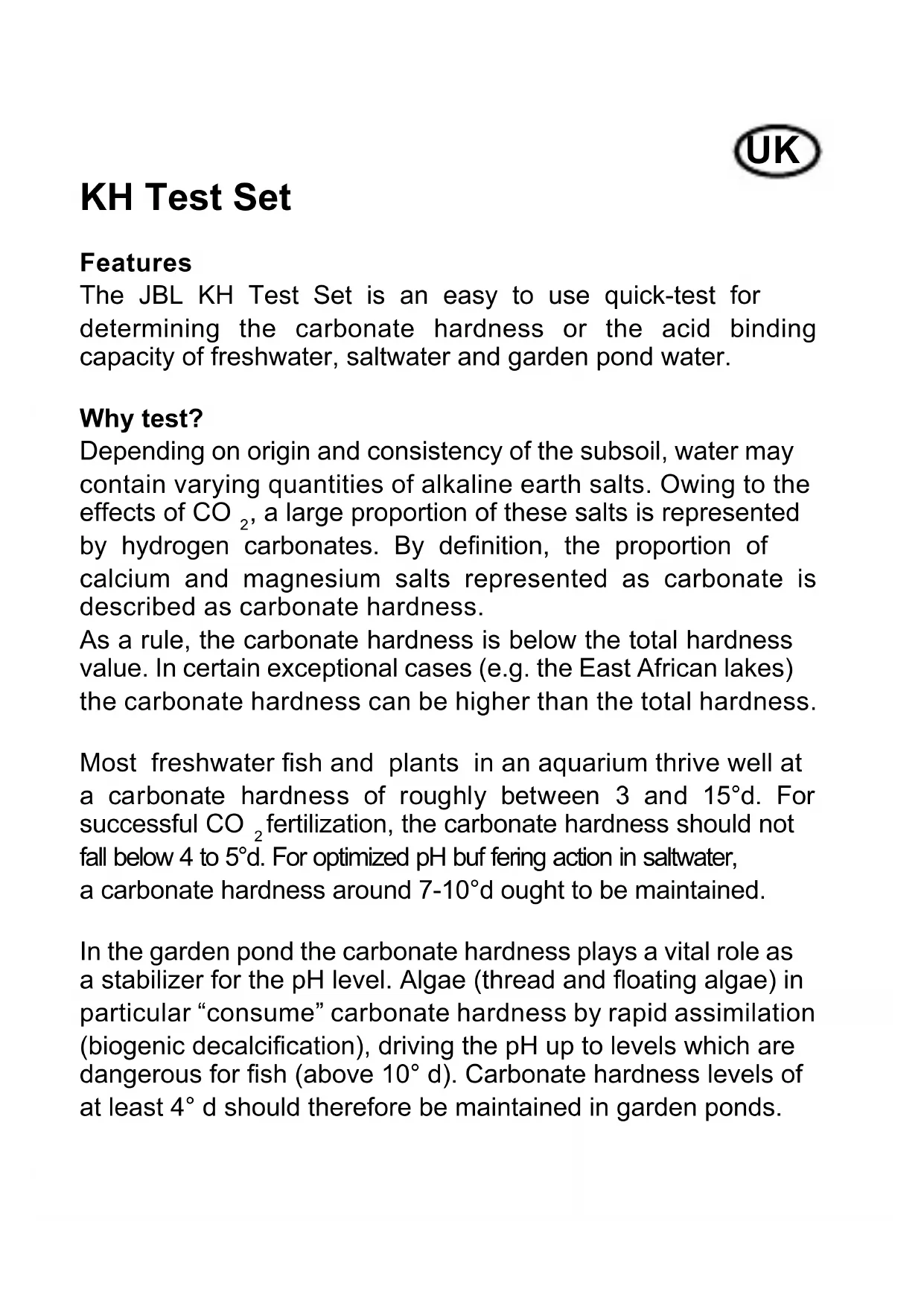 fertilization, the carbonate hardness should not fall below 4 to 5°d. For optimized pH buf fering action in saltwater, a carbonate hardness around 7-10°d ought to be maintained. In the garden pond the carbonate hardness plays a vital role as a stabilizer for the pH level. Algae (thread and oating algae) in particular “consume” carbonate hardness by rapid assimilation (biogenic decalcication), driving the pH up to levels which are dangerous for sh (above 10° d). Carbonate hardness levels of at least 4° d should therefore be maintained in garden ponds.UK What to do in the event of unfavourable values There are various methods for reducing water hardness (e.g. by using a reverse osmosis unit such as the JBL Osmose 120). Ask your pet shop specialist for details. Use JBL AquaDur Plus or JBL pH-Plus to increase the carbonate hardness in freshwater aquariums. Use JBL CalciuMarin in marine aquariums. In garden ponds the carbonate hardness can be increased by the addition of JBL StabiloPond KH. Instructions