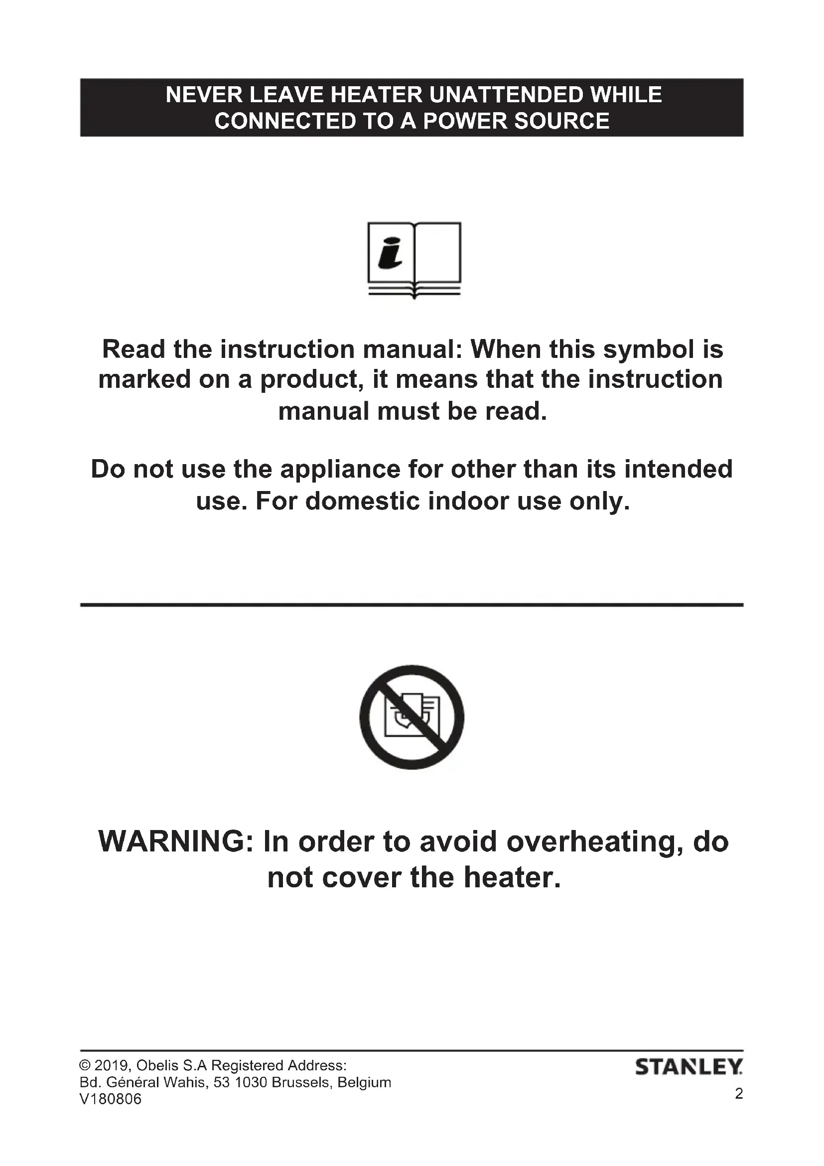 FUNCTIONS / SETTINGS Unit is Off Fan Runs - No Heating Fan Runs - Half Power Heating Fan Runs - Full Power Heating NOTE: The fan will run continuously while the heater is operating. SPECIFICATIONS Specications subject to change without notice© 2019, Obelis S.A Registered Address: Bd. Général Wahis, 53 1030 Brussels, BelgiumNEVER LEAVE HEATER UNATTENDED WHILE CONNECTED TO A POWER SOURCE V180806 Safety Information IMPORTANT: Read and understand all of the safety information and instructions in this manual before operating your heater. RISK OF EXPLOSION! Do Not operate this heater where there are harmful, explosive or flam- mable gasses, fumes or hazard- ous substances. DANGER RISK OF FIRE! Do Not operate this heater near combustible materials. WARNING ELECTRIC SHOCK HAZARD! Do not use this heater in the immediate surroundings of a bath, a shower, or a swimming pool. WARNING BURN HAZARD! Do Not touch the front of heater while it is operating. This heater is hot while operating. WARNING© 2019, Obelis S.A Registered Address: Bd. Général Wahis, 53 1030 Brussels, Belgium