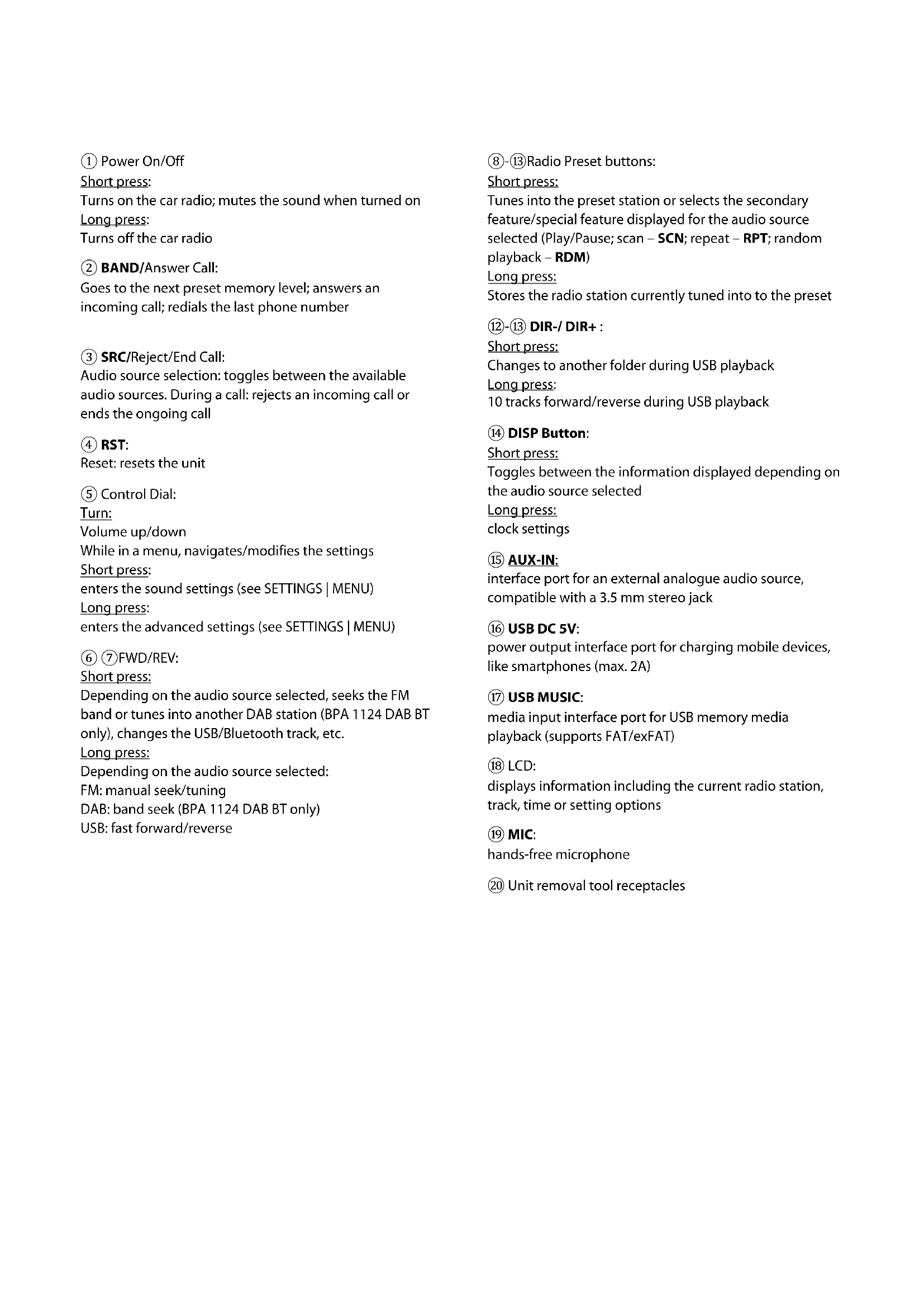 Short press: Turns on the car radio; mutes the sound when turned on Long press: Turns off the car radio ② BAND/Answer Call: Goes to the next preset memory level; answers an incoming call; redials the last phone number ③ SRC/Reject/End Call: Audio source selection: toggles between the available audio sources. During a call: rejects an incoming call or ends the ongoing call ④ RST: Reset: resets the unit ⑤ Control Dial: Turn: Volume up/down While in a menu, navigates/modifies the settings Short press: enters the sound settings (see SETTINGS | MENU) Long press: enters the advanced settings (see SETTINGS | MENU) ⑥ ⑦FWD/REV: Short press: Depending on the audio source selected, seeks the FM band or tunes into another DAB station (BPA 1124 DAB BT only), changes the USB/Bluetooth track, etc. Long press: Depending on the audio source selected: FM: manual seek/tuning DAB: band seek (BPA 1124 DAB BT only) USB: fast forward/reverse ⑧-⑬Radio Preset buttons: Short press: Tunes into the preset station or selects the secondary feature/special feature displayed for the audio source selected (Play/Pause; scan – SCN; repeat – RPT; random playback – RDM) Long press: Stores the radio station currently tuned into to the preset ⑫-⑬ DIR-/ DIR+ : Short press: Changes to another folder during USB playback Long press: 10 tracks forward/reverse during USB playback ⑭ DISP Button: Short press: Toggles between the information displayed depending on the audio source selected Long press: clock settings ⑮ AUX-IN: interface port for an external analogue audio source, compatible with a 3.5 mm stereo jack ⑯ USB DC 5V: power output interface port for charging mobile devices, like smartphones (max. 2A) ⑰ USB MUSIC: media input interface port for USB memory media playback (supports FAT/exFAT) ⑱ LCD: displays information including the current radio station, track, time or setting options ⑲ MIC: hands-free microphone ⑳ Unit removal tool receptaclesEN