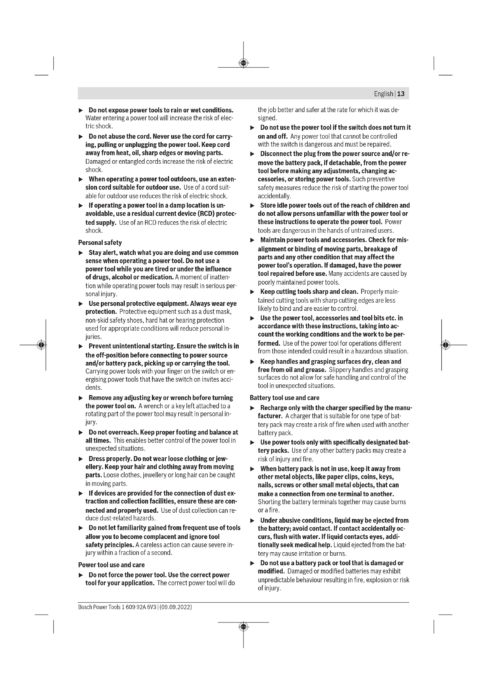 äußeren Abmessung größer als 25cm sind, im Einzel- handelsgeschäft oder in unmittelbarer Nähe hierzu un- entgeltlich zurückzunehmen; die Rücknahme darf nicht an den Kauf eines Elektro- oder Elektronikgerätes ge- knüpft werden und ist auf drei Altgeräte pro Geräteart beschränkt. Der Vertreiber hat beim Abschluss des Kaufvertrags für das neue Elektro- oder Elektronikgerät den Endnutzer über die Möglichkeit zur unentgeltlichen Rückgabe bzw. Abholung des Altgeräts zu informieren und den Endnutzer nach seiner Absicht zu befragen, ob bei der Auslieferung des neuen Ge- räts ein Altgerät zurückgegeben wird. Dies gilt auch bei Vertrieb unter Verwendung von Fernkom- munikationsmitteln, wenn die Lager- und Versandflächen für Elektro- und Elektronikgeräte mindestens 400m² betragen oder die gesamten Lager- und Versandflächen mindestens 800m² betragen, wobei die unentgeltliche Abholung auf Elektro- und Elektronikgeräte der Kategorien 1 (Wärmeüber- träger), 2 (Bildschirmgeräte) und 4 (Großgeräte mit mindes- tens einer äußeren Abmessung über 50cm) beschränkt ist. Für alle übrigen Elektro- und Elektronikgeräte muss der Ver- treiber geeignete Rückgabemöglichkeiten in zumutbarer Ent- fernung zum jeweiligen Endnutzer gewährleisten; das gilt auch für Altgeräte, die in keiner äußeren Abmessung größer als 25cm sind, die der Endnutzer zurückgeben will, ohne ein neues Gerät zu kaufen. Akkus/Batterien: Li-Ion: Bitte beachten Sie die Hinweise im Abschnitt Transport (sie- he „Transport“, Seite11). English Safety Instructions General Power Tool Safety Warnings WARNING Read all safety warnings, instruc- tions, illustrations and specifica- tions provided with this power tool. Failure to follow all in- structions listed below may result in electric shock, fire and/ or serious injury. Save all warnings and instructions for future reference. The term "power tool" in the warnings refers to your mains- operated (corded) power tool or battery-operated (cord- less) power tool. Work area safety u Keep work area clean and well lit. Cluttered or dark areas invite accidents. u Do not operate power tools in explosive atmospheres, such as in the presence of flammable liquids, gases or dust. Power tools create sparks which may ignite the dust or fumes. u Keep children and bystanders away while operating a power tool. Distractions can cause you to lose control. Electrical safety u Power tool plugs must match the outlet. Never modify the plug in any way. Do not use any adapter plugs with earthed (grounded) power tools. Unmodified plugs and matching outlets will reduce risk of electric shock. u Avoid body contact with earthed or grounded sur- faces, such as pipes, radiators, ranges and refrigerat- ors. There is an increased risk of electric shock if your body is earthed or grounded. 1 609 92A 6V3 | (09.09.2022) Bosch Power ToolsEnglish | 13 u Do not expose power tools to rain or wet conditions. Water entering a power tool will increase the risk of elec- tric shock. u Do not abuse the cord. Never use the cord for carry- ing, pulling or unplugging the power tool. Keep cord away from heat, oil, sharp edges or moving parts. Damaged or entangled cords increase the risk of electric shock. u When operating a power tool outdoors, use an exten- sion cord suitable for outdoor use. Use of a cord suit- able for outdoor use reduces the risk of electric shock. u If operating a power tool in a damp location is un- avoidable, use a residual current device (RCD) protec- ted supply. Use of an RCD reduces the risk of electric shock. Personal safety u Stay alert, watch what you are doing and use common sense when operating a power tool. Do not use a power tool while you are tired or under the influence of drugs, alcohol or medication. A moment of inatten- tion while operating power tools may result in serious per- sonal injury. u Use personal protective equipment. Always wear eye protection. Protective equipment such as a dust mask, non-skid safety shoes, hard hat or hearing protection used for appropriate conditions will reduce personal in- juries. u Prevent unintentional starting. Ensure the switch is in the off-position before connecting to power source and/or battery pack, picking up or carrying the tool. Carrying power tools with your finger on the switch or en- ergising power tools that have the switch on invites acci- dents. u Remove any adjusting key or wrench before turning the power tool on. A wrench or a key left attached to a rotating part of the power tool may result in personal in- jury. u Do not overreach. Keep proper footing and balance at all times. This enables better control of the power tool in unexpected situations. u Dress properly. Do not wear loose clothing or jew- ellery. Keep your hair and clothing away from moving parts. Loose clothes, jewellery or long hair can be caught in moving parts. u If devices are provided for the connection of dust ex- traction and collection facilities, ensure these are con- nected and properly used. Use of dust collection can re- duce dust-related hazards. u Do not let familiarity gained from frequent use of tools allow you to become complacent and ignore tool safety principles. A careless action can cause severe in- jury within a fraction of a second. Power tool use and care u Do not force the power tool. Use the correct power tool for your application. The correct power tool will do the job better and safer at the rate for which it was de- signed. u Do not use the power tool if the switch does not turn it on and off. Any power tool that cannot be controlled with the switch is dangerous and must be repaired. u Disconnect the plug from the power source and/or re- move the battery pack, if detachable, from the power tool before making any adjustments, changing ac- cessories, or storing power tools. Such preventive safety measures reduce the risk of starting the power tool accidentally. u Store idle power tools out of the reach of children and do