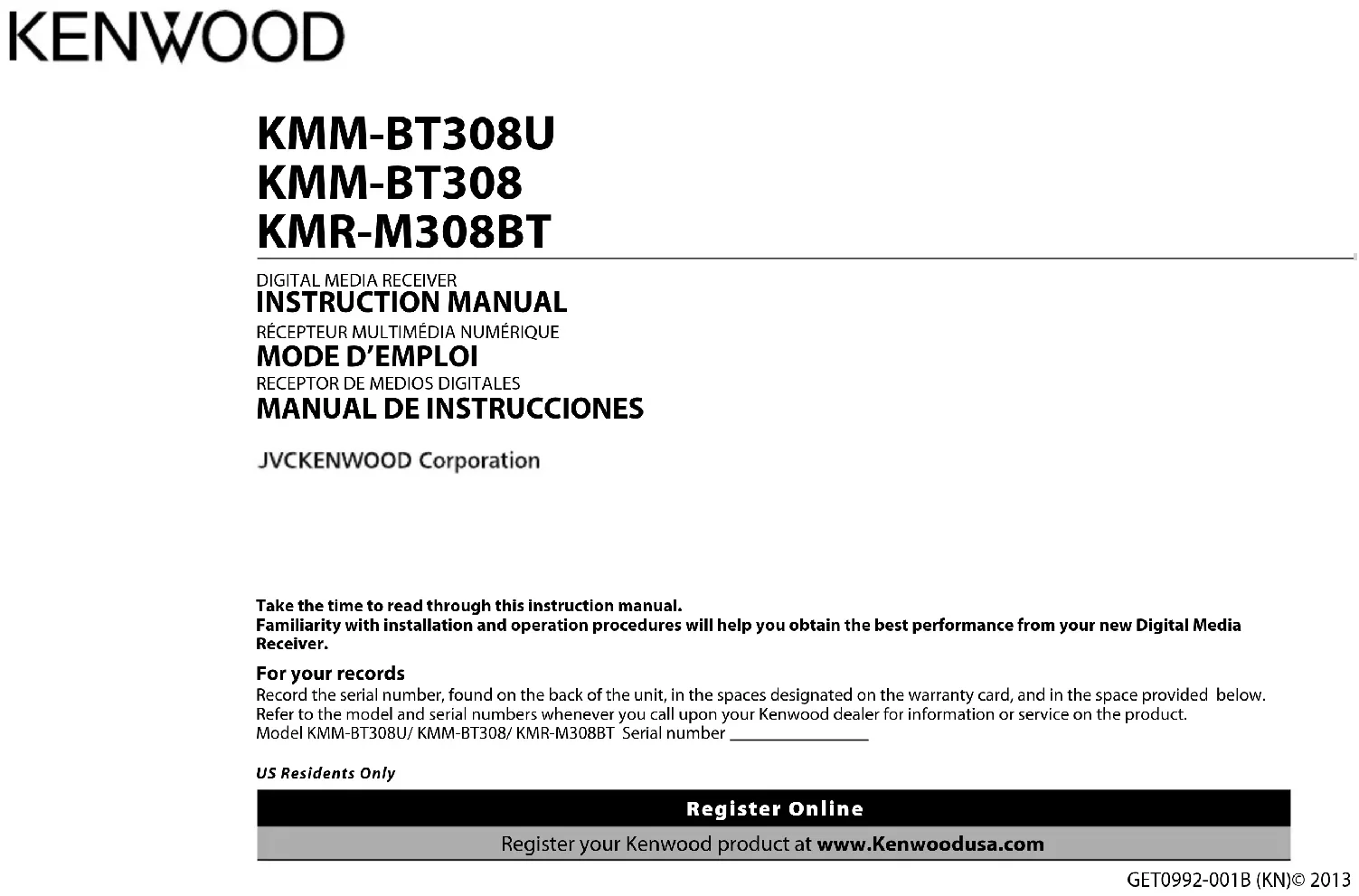 Data Size: B6L (182 mm x 128 mm)Book Size: B6L (182 mm x 128 mm)Take the time to read through this instruction manual. Familiarity with installation and operation procedures will help you obtain the best performance from your new Digital Media Receiver. For your records Record the serial number, found on the back of the unit, in the spaces designated on the warranty card, and in the space provided below. Refer to the model and serial numbers whenever you call upon your Kenwood dealer for information or service on the product. Model KMM-BT308U/ KMM-BT308/ KMR-M308BT Serial number US Residents Only Register Online Register your Kenwood product at www.Kenwoodusa.com GET0992-001B (KN)© 2013 JVC KENWOOD Corporation KMM-BT308U KMM-BT308 KMR-M308BT