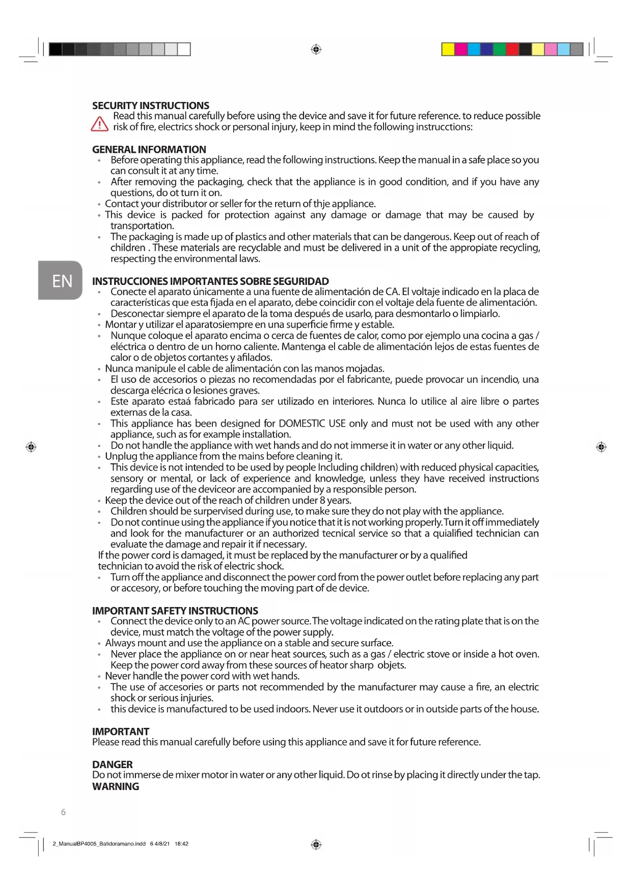 - this device is manufactured to be used indoors. Never use it outdoors or in outside parts of the house. IMPORTANT Please read this manual carefully before using this appliance and save it for future reference. DANGER Do not immerse de mixer motor in water or any other liquid. Do ot rinse by placing it directly under the tap. WARNING 2_ManualBP4005_Batidoramano.indd 6 4/8/21 18:427