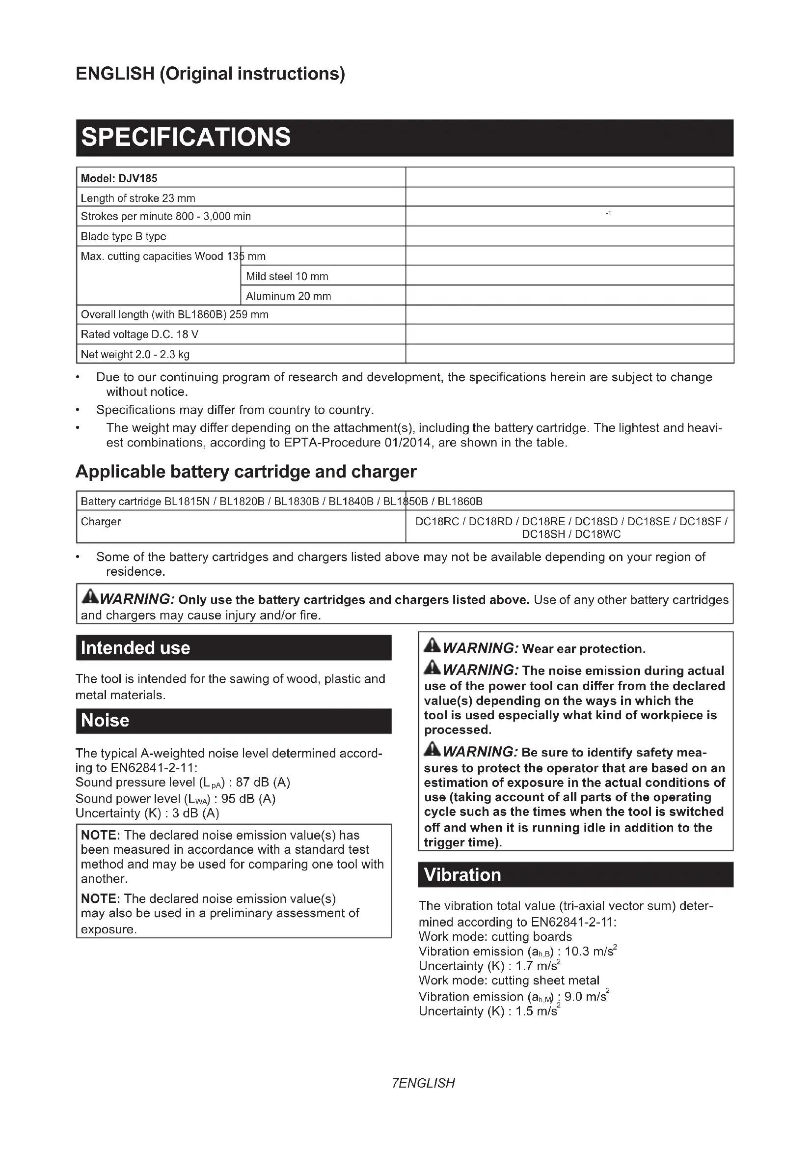 - Theweightmaydierdependingontheattachment(s),includingthebatterycartridge.Thelightestandheavi- estcombinations,accordingtoEPTA-Procedure01/2014,areshowninthetable. Applicable battery cartridge and charger Battery cartridge BL1815N/BL1820B/BL1830B/BL1840B/BL1850B/BL1860B Charger DC18RC/DC18RD/DC18RE/DC18SD/DC18SE/DC18SF/ DC18SH/DC18WC