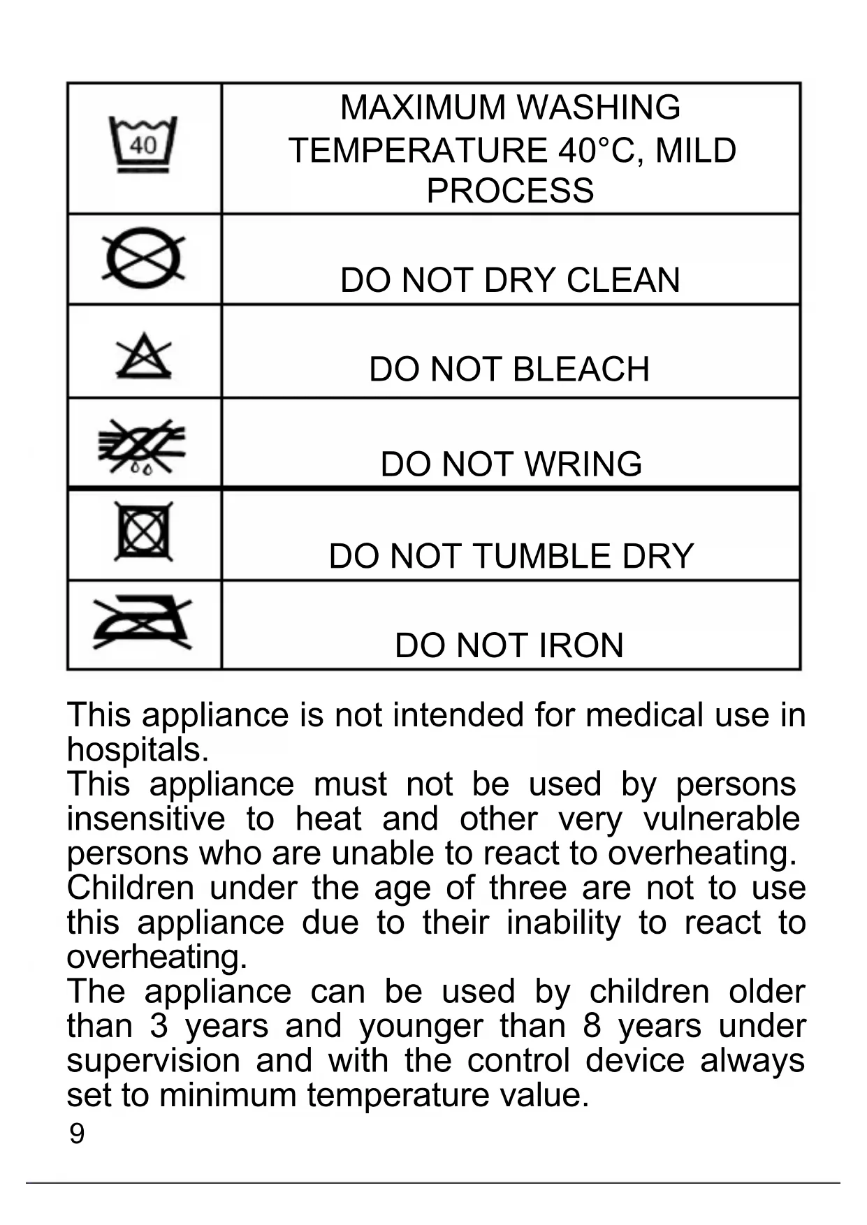 Warnings GBThis appliance is not intended for medical use in hospitals. This appliance must not be used by persons insensitive to heat and other very vulnerable persons who are unable to react to overheating. Children under the age of three are not to use this appliance due to their inability to react to overheating. The appliance can be used by children older than 3 years and younger than 8 years under supervision and with the control device always set to minimum temperature value.