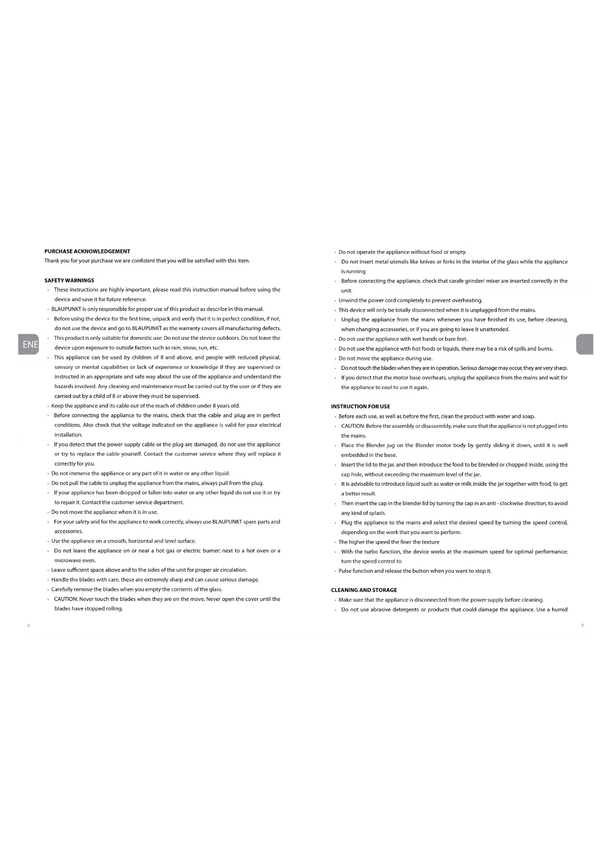 GUARANTEE DOCUMENT Thank you for purchasing this BLAUPUNKT product, this device has been checked in all its components meticulously, so we guarantee the correct operation, but for this to be the case we need that YOUread the instruction book carefully, as this will contribute to the best performance of this article. R.S.A guarantees to the buyer of this product, a total guarantee of TWO YEARS, governed by the established conditions whose regulation is found in Royal Legislative Decree 1/2007 of 16 December, which approves the revised text of the General Law for the Defense of Consumers andUsers, (articles 114 to 127) R.S.A is committed to repairs are completely free, labor and spare parts, including.The Technical Assistance Service will resolve any repairs that may be required by this apparatus.Carefully review the INSTRUCTION BOOK included, on the use, maintenance and conservation of the device.Any anomaly that could occur due to the non-observance of such instructions will not be protected for the guarantee.The date of sale of the device, for the purposes of warranty period, will be that which appears on the purchase invoice. Guarantee operation: As regards all those compliance defects detected by the technical assistance, which are manifested within six months of the delivery of the goods, it is assumed that they already existed on that date, the intervention will be completely free, (unless this hypothesis is incompatible with the nature or nature of the conformity defect). During the following eighteen months, it must be the user who demonstrates. That the lack of conformity It was coming at the time of delivery. MANUFACTURED CHINA FOR BLAUPUNKTManufacturer Name: RAMSONS, S.A.Adress: Pedro Muñoz Torres nº 1Post Code: 41006SEVILLAWe declare under our responsibility that the product:Product Description: BLENDER WITH GLASS JUGModel: BP4002Brand: BLAUPUNKTIt complies with the European Union legislation in compliance with the 2004/108 / EU guidelinesThe standards apply: EN 55014-1: 2006+A1:+A2:EN 55014-2: 1997+A1:+A2:EN 61000-3-2:2006+A1:+A2:EN 61000-3-3:2013Name: Vivek SadhwaniPosition : manager Date: 1 de October 2020 Signature:
