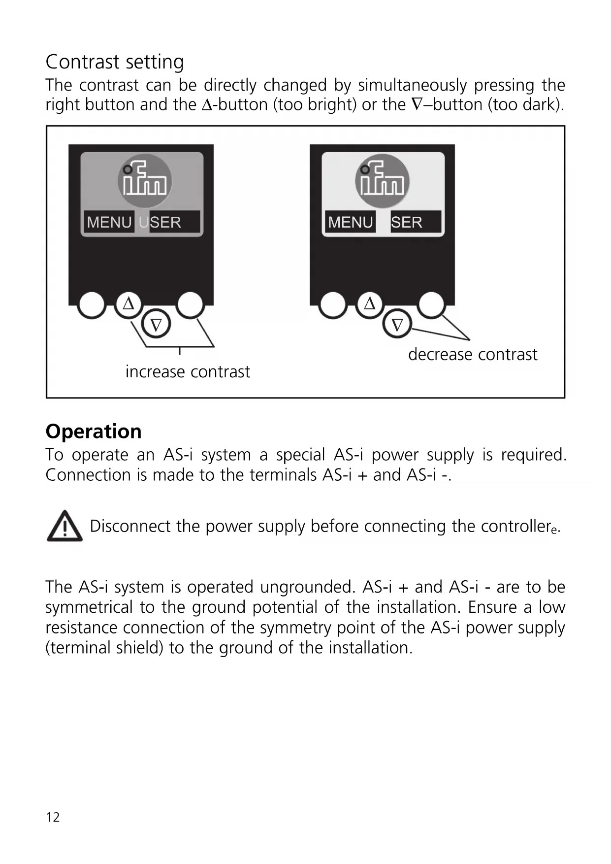 reserved power CANopen LED indicators and pin connection CANopen interface display pushbuttons only AC1322 Network Status Module StatusContrast setting The contrast can be directly changed by simultaneously pressing the right button and the Δ-button (too bright) or the ∇−button (too dark). Operation To operate an AS-i system a special AS-i power supply is required. Connection is made to the terminals AS-i + and AS-i -. Disconnect the power supply before connecting the controller