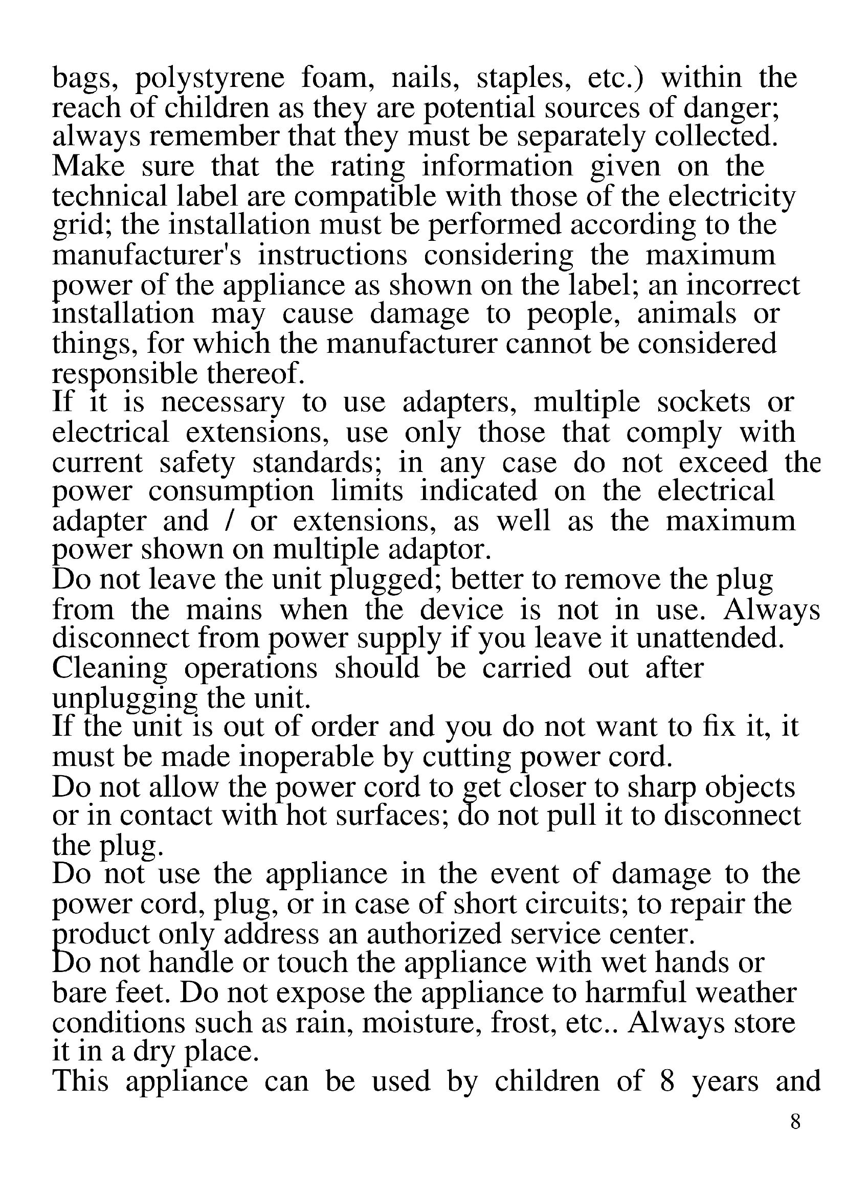 The following are important notes on the installation, use and maintenance; save this instruction manual for future reference; use the equipment only as specified in this guide; any other use is considered improper and dangerous; therefore, the manufacturer cannot be held responsible in the event of damages caused by improper, incorrect or unreasonable use. Before use, ensure the equipment is undamaged; if in doubt, do not attempt to use it and contact the authorized service center; do not leave packing materials (i.e. plastic8 bags, polystyrene foam, nails, staples, etc.) within the reach of children as they are potential sources of danger; always remember that they must be separately collected. Make sure that the rating information given on the technical label are compatible with those of the electricity grid; the installation must be performed according to the manufacturer's instructions considering the maximum power of the appliance as shown on the label; an incorrect installation may cause damage to people, animals or things, for which the manufacturer cannot be considered responsible thereof. If it is necessary to use adapters, multiple sockets or electrical extensions, use only those that comply with current safety standards; in any case do not exceed the power consumption limits indicated on the electrical adapter and / or extensions, as well as the maximum power shown on multiple adaptor. Do not leave the unit plugged; better to remove the plug from the mains when the device is not in use. Always disconnect from power supply if you leave it unattended. Cleaning operations should be carried out after unplugging the unit. If the unit is out of order and you do not want to fix it, it must be made inoperable by cutting power cord. Do not allow the power cord to get closer to sharp objects or in contact with hot surfaces; do not pull it to disconnect the plug. Do not use the appliance in the event of damage to the power cord, plug, or in case of short circuits; to repair the product only address an authorized service center. Do not handle or touch the appliance with wet hands or bare feet. Do not expose the appliance to harmful weather conditions such as rain, moisture, frost, etc.. Always store it in a dry place. This appliance can be used by children of 8 years and9 above and persons with reduced physical, sensory or mental capabilities or lack of experience and knowledge if they received supervision or instruction concerning use of the appliance in a safe way and understand hazards involved; children shall not play with the appliance; cleaning and user maintenance shall not be made by children without supervision. Children must not play with the appliance. Keep the appliance and its cord out of reach of children less than 8 years. If the power cord is damaged, or in case of failure and / or malfunction do not tamper with the unit. The reparation must be done by manufacturer or by service center authorized by the manufacturer in order to prevent any risk. Failure to comply with the above may compromise the unit safety and invalidate the warranty.