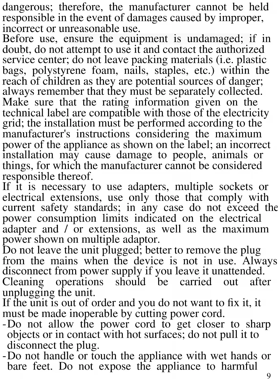 The following are important notes on the installation, use and maintenance; save this instruction manual for future reference; use the equipment only as specified in this guide; any other use is considered improper and9 dangerous; therefore, the manufacturer cannot be held responsible in the event of damages caused by improper, incorrect or unreasonable use. Before use, ensure the equipment is undamaged; if in doubt, do not attempt to use it and contact the authorized service center; do not leave packing materials (i.e. plastic bags, polystyrene foam, nails, staples, etc.) within the reach of children as they are potential sources of danger; always remember that they must be separately collected. Make sure that the rating information given on the technical label are compatible with those of the electricity grid; the installation must be performed according to the manufacturer's instructions considering the maximum power of the appliance as shown on the label; an incorrect installation may cause damage to people, animals or things, for which the manufacturer cannot be considered responsible thereof. If it is necessary to use adapters, multiple sockets or electrical extensions, use only those that comply with current safety standards; in any case do not exceed the power consumption limits indicated on the electrical adapter and / or extensions, as well as the maximum power shown on multiple adaptor. Do not leave the unit plugged; better to remove the plug from the mains when the device is not in use. Always disconnect from power supply if you leave it unattended. Cleaning operations should be carried out after unplugging the unit. If the unit is out of order and you do not want to fix it, it must be made inoperable by cutting power cord. - Do not allow the power cord to get closer to sharp objects or in contact with hot surfaces; do not pull it to disconnect the plug. - Do not handle or touch the appliance with wet hands or bare feet. Do not expose the appliance to harmful10 weather conditions such as rain, moisture, frost, etc.. Always store it in a dry place. - Do not use the appliance in the event of damage to the power cord, plug, or in case of short circuits; to repair the product only address an authorized service center. - This appliance can be used by children of 8 years and above and persons with reduced physical, sensory or mental capabilities or lack of experience and knowledge if they received supervision or instruction concerning use of the appliance in a safe way and understand hazards involved; children shall not play with the appliance; cleaning and user maintenance shall not be made by children without supervision. - Children must not play with the appliance. - Keep the appliance and its cord out of reach of children less than 8 years. If the power cord is damaged, or in case of failure and / or malfunction do not tamper with the unit. The reparation must be done by manufacturer or by service center authorized by the manufacturer in order to prevent any risk. Failure to comply with the above may compromise the unit safety and invalidate the warranty.