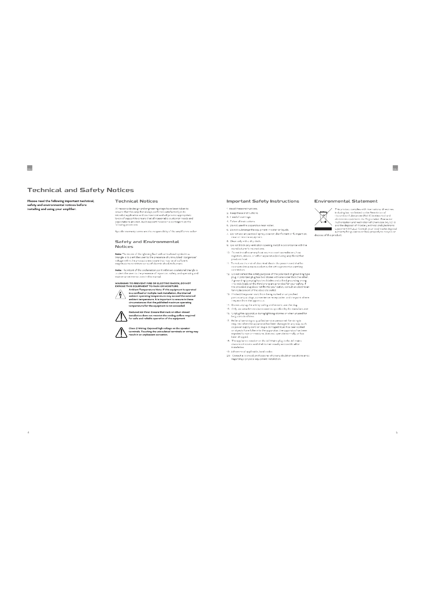 3Technical and Safety Notices Technical Notices All reasonable design and engineering steps have been taken to ensure that this amplifier always performs satisfactorily in its intended application and environment and will provide appropriate levels of support to ensure that all reasonable customer needs and expectations are met. Such support however is contingent on the following provisions. Specific warran terms are the responsibili of the amplifier re-seller. Safety and Environmental Notices Note: The intent of the lightning flash with arrowhead symbol in a triangle is to alert the user to the presence of uninsulated “dangerous” voltage within the product’s enclosure that may be of sucient magnitude to constitute a risk of electric shock to humans. Note: The intent of the exclamation point within an equilateral triangle is to alert the user to the presence of important safe, and operating and maintenance instructions in this manual. WARNING! TO PREVENT FIRE OR ELECTRIC SHOCK, DO NOT EXPOSE THIS EQUIPMENT TO RAIN OR MOISTURE. Ambient Temperature Note: If this equipment is operated in a confined or multiple rack installation, the internal ambient operating temperature may exceed the external ambient temperature. It is important to ensure in these circumstances that the published maximum operating temperature for the equipment is not exceeded. Reduced Air Flow: Ensure that rack or other closed installation does not restrict the cooling airflow required for safe and reliable operation of the equipment. Class 2 Wiring: Exposed high voltage on the speaker terminals. Touching the uninsulated terminals or wiring may result in an unpleasant sensation. Important Safety Instructions