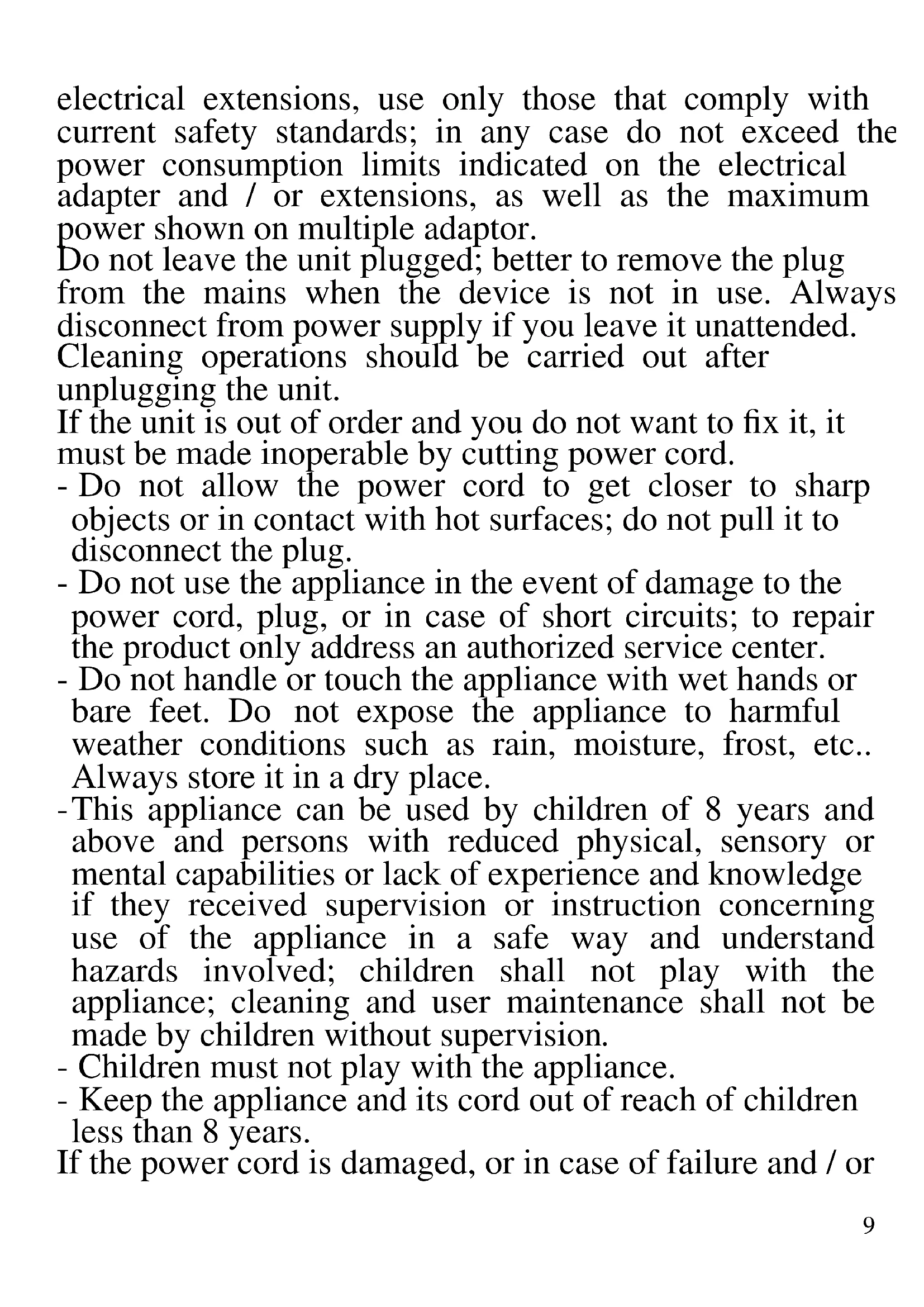 The following are important notes on the installation, use and maintenance; save this instruction manual for future reference; use the equipment only as specified in this guide; any other use is considered improper and dangerous; therefore, the manufacturer cannot be held responsible in the event of damages caused by improper, incorrect or unreasonable use. Before use, ensure the equipment is undamaged; if in doubt, do not attempt to use it and contact the authorized service center; do not leave packing materials (i.e. plastic bags, polystyrene foam, nails, staples, etc.) within the reach of children as they are potential sources of danger; always remember that they must be separately collected. Make sure that the rating information given on the technical label are compatible with those of the electricity grid; the installation must be performed according to the manufacturer's instructions considering the maximum power of the appliance as shown on the label; an incorrect installation may cause damage to people, animals or things, for which the manufacturer cannot be considered responsible thereof. If it is necessary to use adapters, multiple sockets or9 electrical extensions, use only those that comply with current safety standards; in any case do not exceed the power consumption limits indicated on the electrical adapter and / or extensions, as well as the maximum power shown on multiple adaptor. Do not leave the unit plugged; better to remove the plug from the mains when the device is not in use. Always disconnect from power supply if you leave it unattended. Cleaning operations should be carried out after unplugging the unit. If the unit is out of order and you do not want to fix it, it must be made inoperable by cutting power cord. - Do not allow the power cord to get closer to sharp objects or in contact with hot surfaces; do not pull it to disconnect the plug. - Do not use the appliance in the event of damage to the power cord, plug, or in case of short circuits; to repair the product only address an authorized service center. - Do not handle or touch the appliance with wet hands or bare feet. Do not expose the appliance to harmful weather conditions such as rain, moisture, frost, etc.. Always store it in a dry place. - This appliance can be used by children of 8 years and above and persons with reduced physical, sensory or mental capabilities or lack of experience and knowledge if they received supervision or instruction concerning use of the appliance in a safe way and understand hazards involved; children shall not play with the appliance; cleaning and user maintenance shall not be made by children without supervision. - Children must not play with the appliance. - Keep the appliance and its cord out of reach of children less than 8 years. If the power cord is damaged, or in case of failure and / or10 malfunction do not tamper with the unit. The reparation must be done by manufacturer or by service center authorized by the manufacturer in order to prevent any risk. Failure to comply with the above may compromise the unit safety and invalidate the warranty.